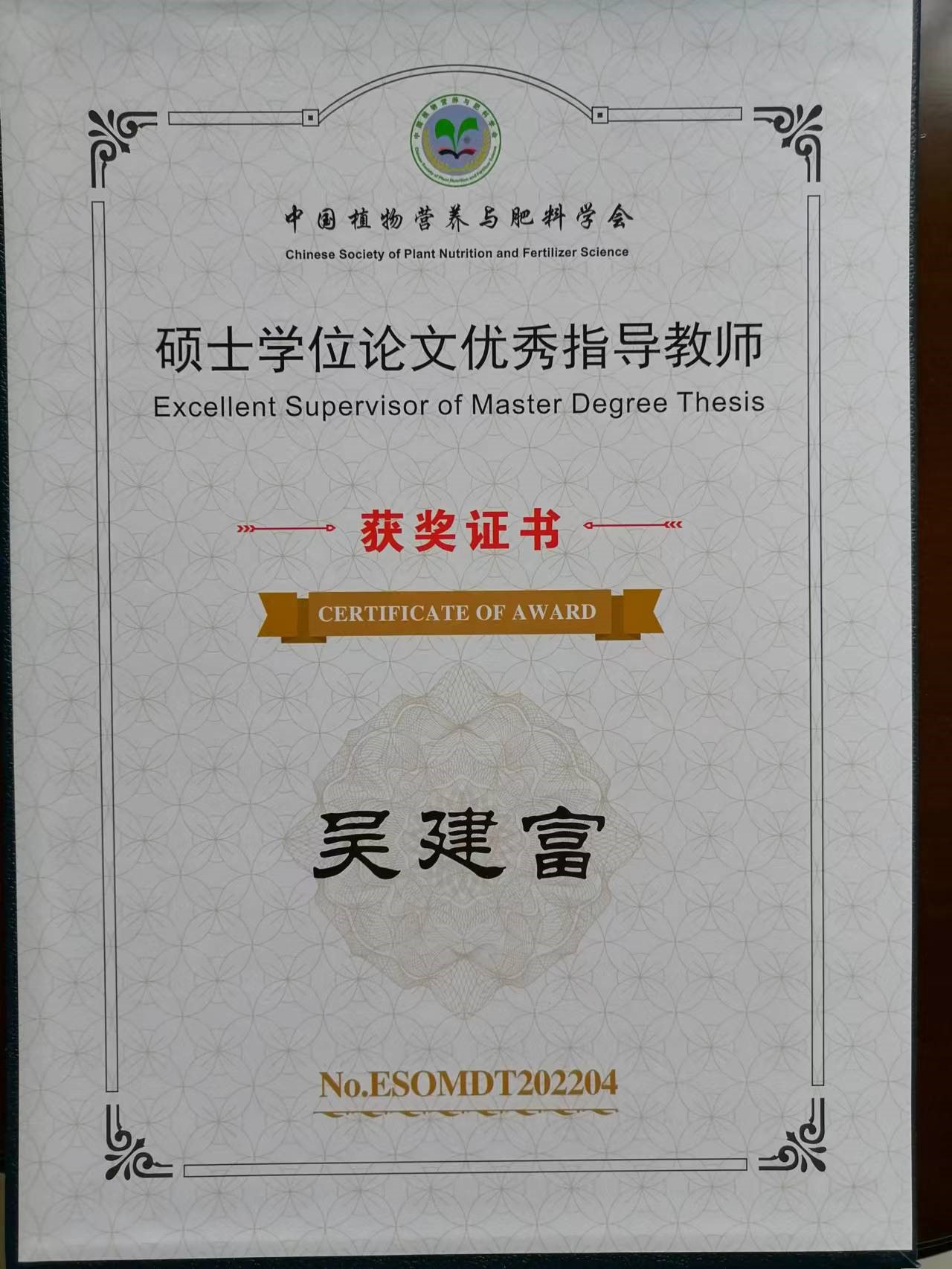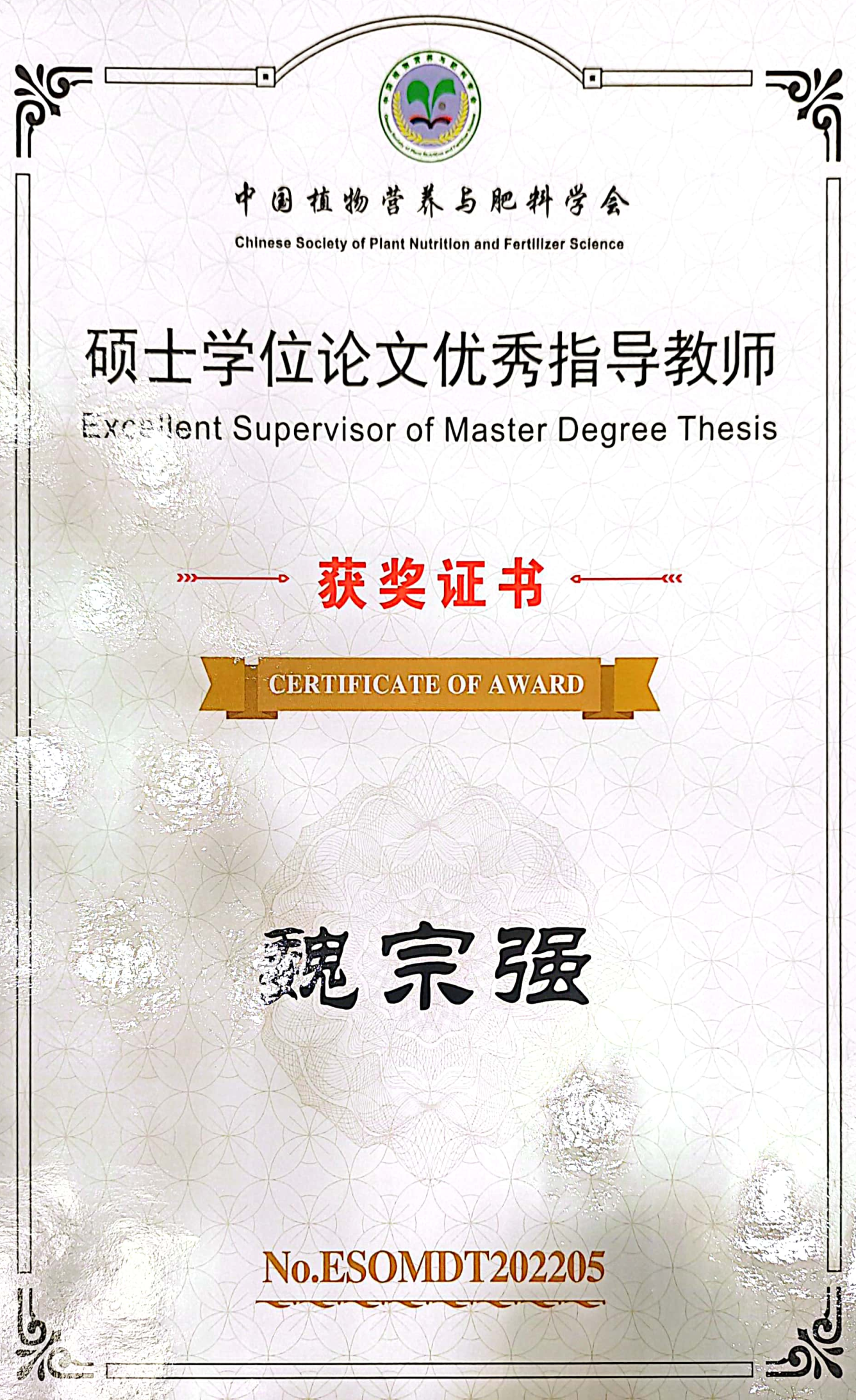 由我院吴建富和魏宗强联合指导的2021届农业资源与环境专业植物营养学方向的硕士研究生郑小妹的硕士学位论文《红壤性水稻土硅有效性及水稻生长对土壤酸化和磷添加的响应》荣获中国植物营养与肥料学会第六届优秀硕士学位论文,吴建富和魏宗强两位指导老师也荣获硕士学位论文优秀指导教师。