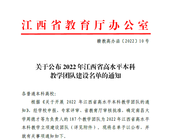 近日,江西省教育厅发布了《关于公布2022年江西省高水平本科教学团队建设名单的通知》文件,公布了2022年江西省高水平本科教学立项建设团队的名单,我院由周春火教授负责的植物营养学教学团队、陈美球教授负责的土地资源管理教学团队(A教学科研型)获批立项,我校共有7个教学团队获批立项。