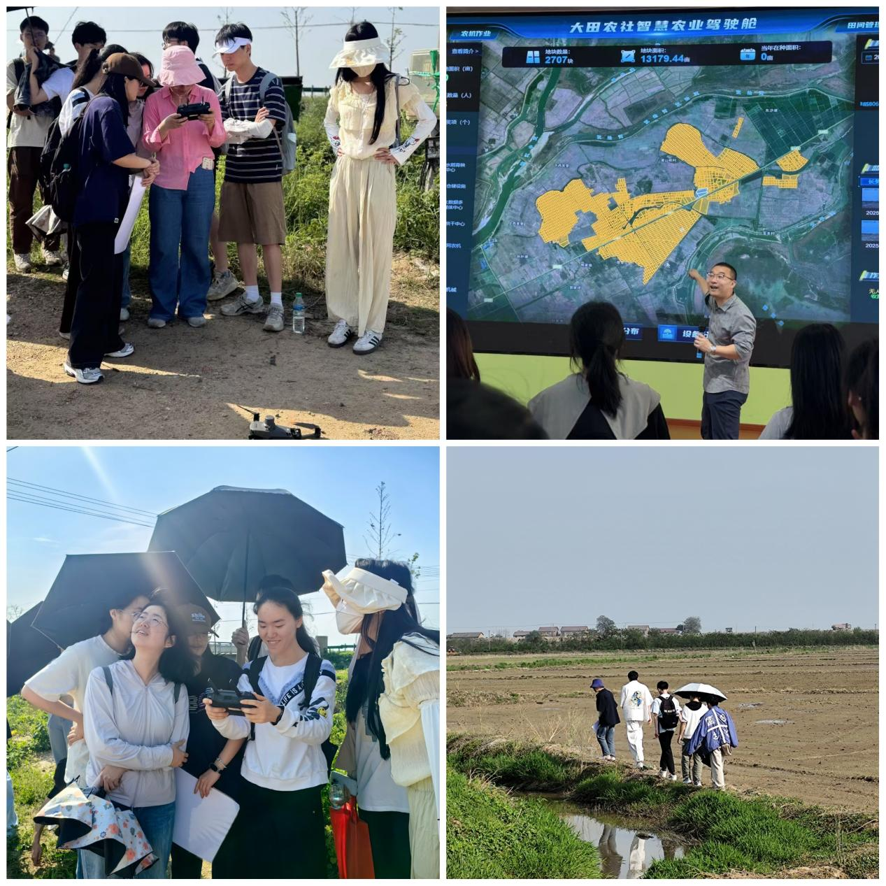 理论讲解结束后,全体师生徒步走向田间地头开展实践教学。学生共分成三组,依次完成了测量田块大小和方位、记录田间道路材质及通达性、调绘沟渠断面尺寸、操作无人机采集多光谱影像数据等教学任务。
