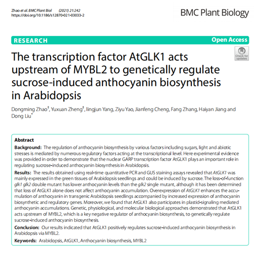 近日,我院2019级资源利用与植物保护专业研究生赵东鸣在《BMC Plant Biology》(SCI 2020 IF=4.215)上发表研究性论文1篇(指导老师:刘栋),主要利用模式植物拟南芥对AtGLKs参与高等植物调控花青素合成的分子机制进行了初步探索。