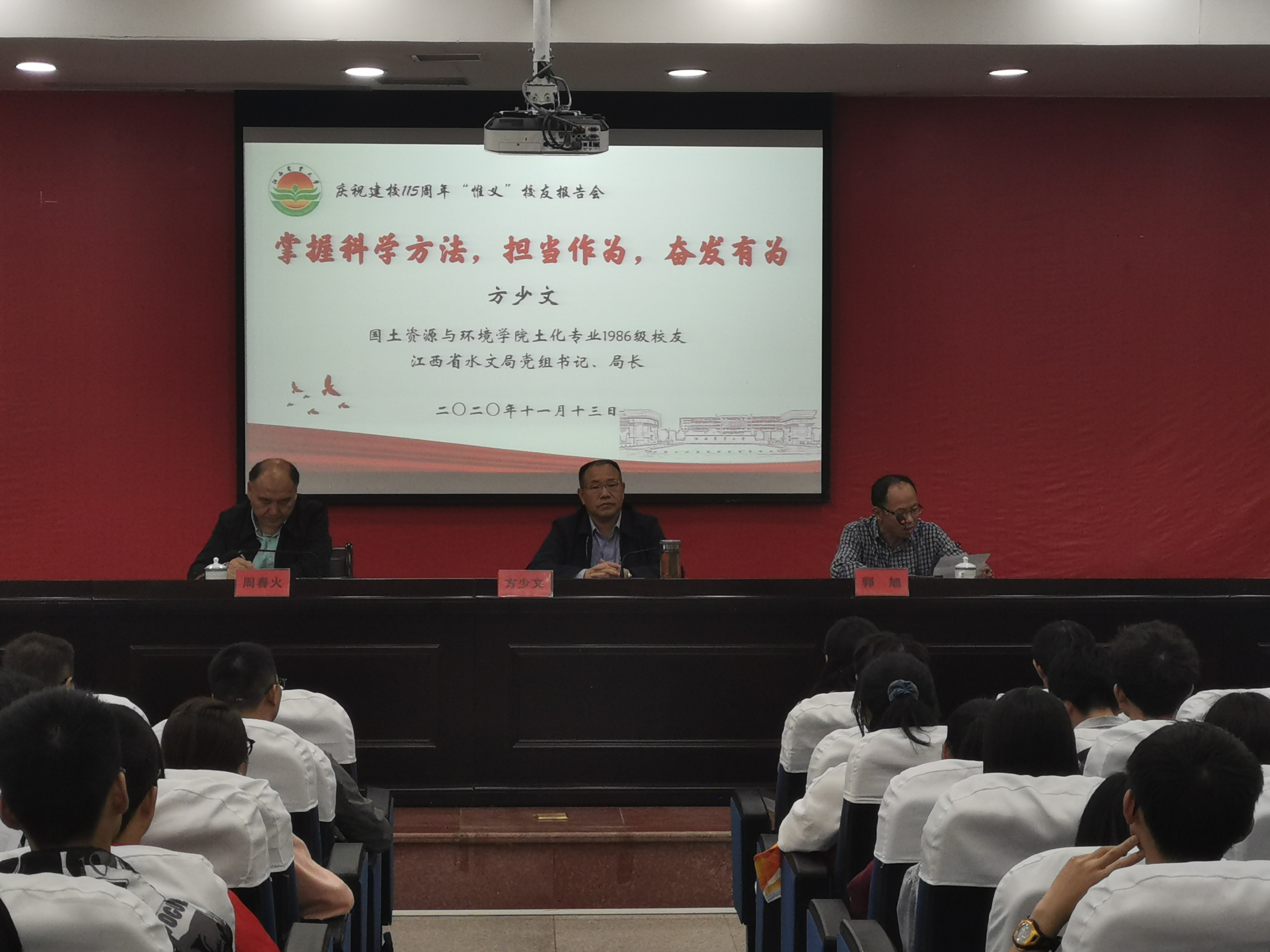 11月13日下午,江西省水文局党组书记、局长、江西农业大学土化专业1986级校友方少华应邀来学校作题为《掌握科学方法,担当实干,奋发有为》的专题报告,国土学院党委书记郭旭、副院长周春火以及各专业师生代表参加了此次报告会,会议由国土学院党委书记郭旭主持。