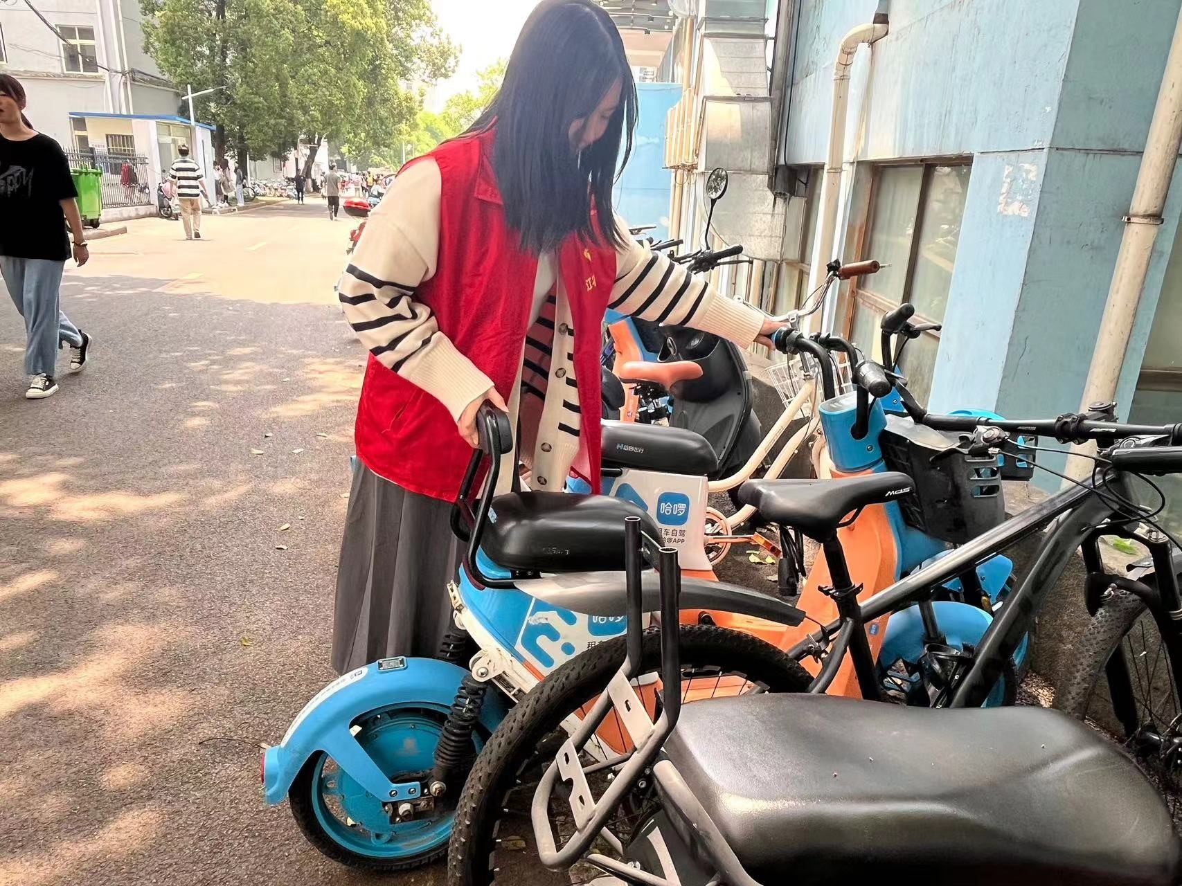 南区12-17栋的地理位置靠近南区的学生食堂“稻香楼”,每当饭点时,人流量激增,就会出现电动车未停放至规定区域内等不文明现象。为了解决因违规停放电动车而导致的交通堵塞、安全隐患问题,国土院的党员、入党积极分子志愿者们穿上红色志愿小马甲,对校园电动车不文明行为进行管理。
