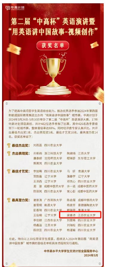 为了提高中高项目学生英语综合能力,推选优秀选手参加2024年第四届新航道国际教育集团主办的“用英语讲中国故事”城市赛,展现中高计划学生风采,中外高水平大学交流计划全国运营中心于2024年3月24日至5月10日举办了第二届“中高杯”英语演讲大赛。来自17所中高计划项目高校共计482名选手参加了此次比赛,经专家评审,共评出最佳杰出奖1名,杰出表现奖5人,最佳才艺奖10人,最具潜力奖14名。我院中高计划项目23级环境科学与工程班梁善诗同学获得“最具潜力奖”。