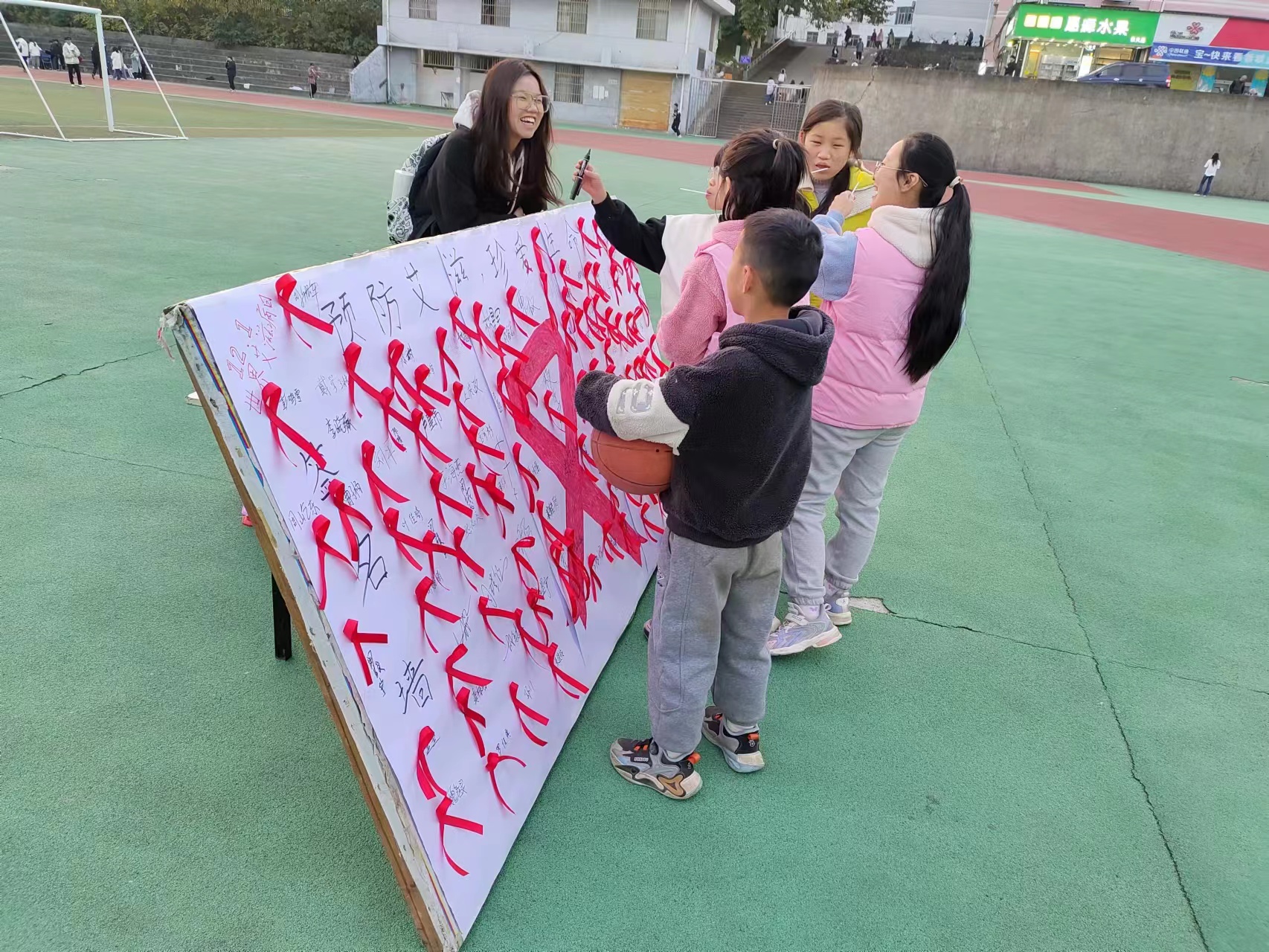 上午,社团成员在南区田径场进行摆点宣传。大家邀请路人一起制作红丝带并签名,然后将制作的红丝带成品粘贴到防艾签名墙,一方面表达着大家对于艾滋病患者的关爱,同时也是一次防艾号召,号召更多的同学了解艾滋病,预防艾滋病,并自觉成为防艾宣传者,以自己的力量让更多人了解防艾相关知识。