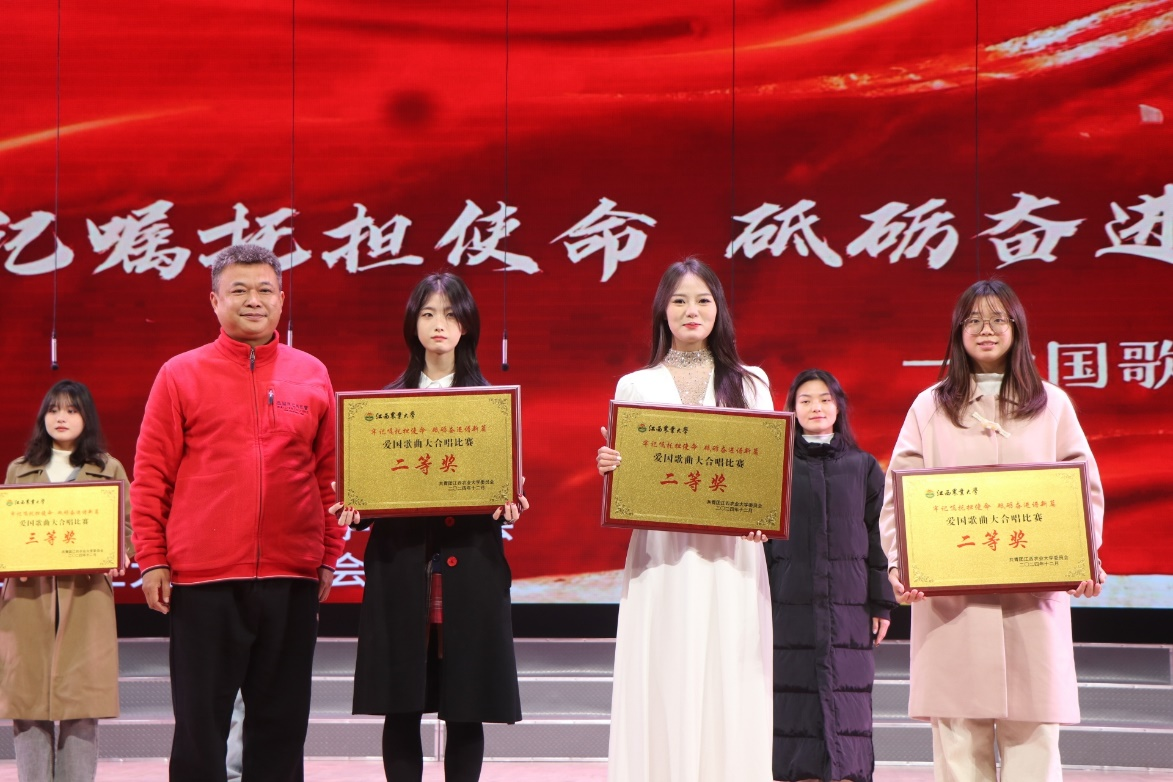 12 月 8 日晚,江西农业大学“牢记嘱托担使命,砥砺奋进谱新篇”爱国歌曲大合唱比赛在校大礼堂举行,学院合唱团凭借选送曲目《我爱你中国》以及学生出色的表现、真挚的情感诠释和精湛的演唱技巧,荣获此次比赛二等奖。