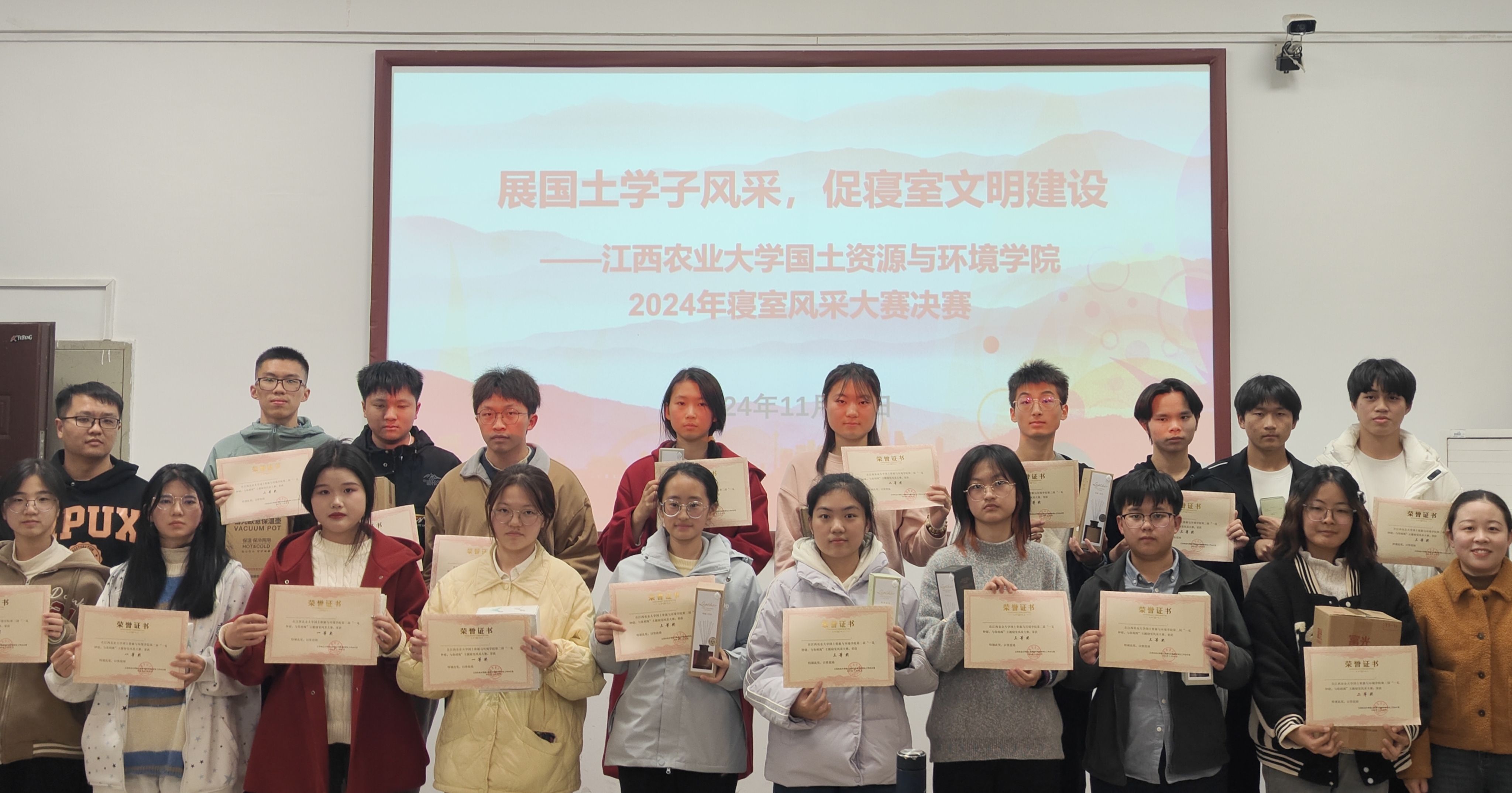 为促进校园文化建设,推动学生共同打造温馨和谐的宿舍环境,11月29日,国土学院于院办209开展了2024年“展国土学子风采,促寝室文明建设”寝室风采大赛决赛,学院团委学工办辅导员陈蕾、赵晨刚和团委学生会主要干部担任评委,各参赛队伍和学生观众约70余人到场答辩、观摩。