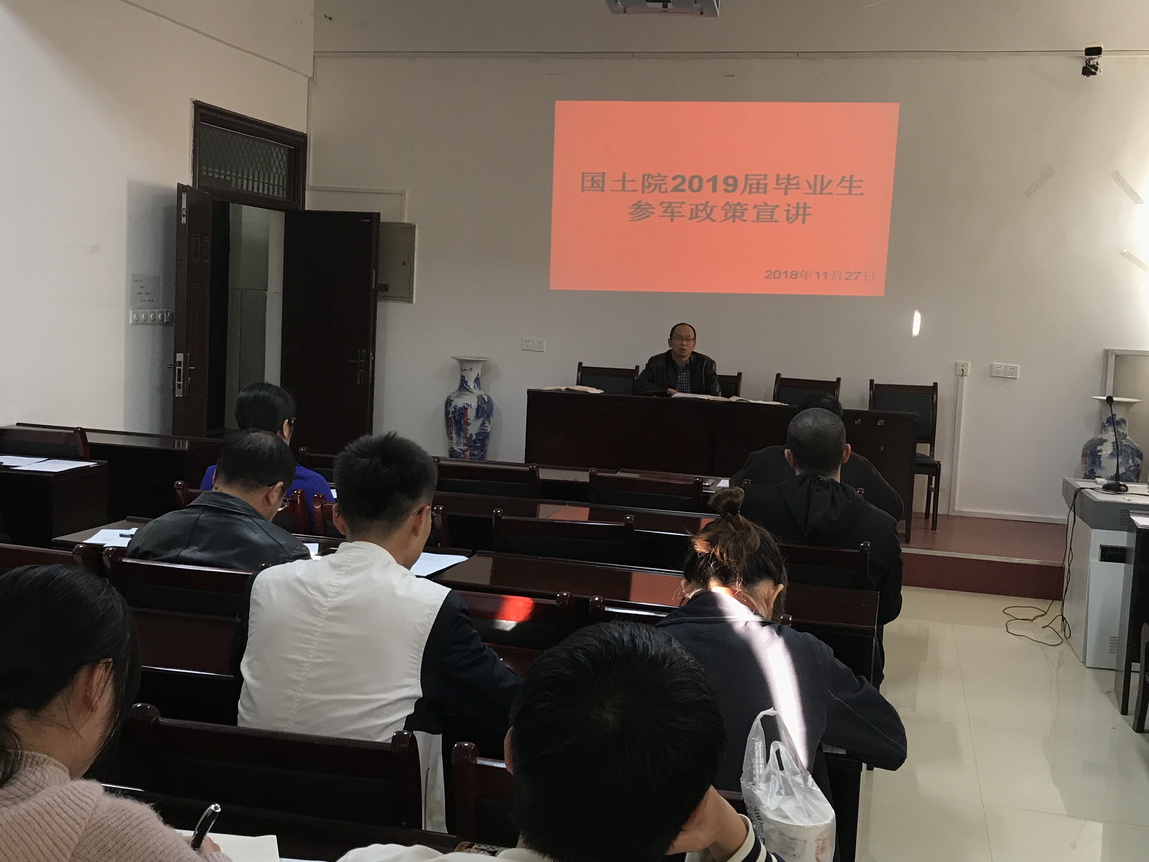为做好2019届毕业生参军入伍政策宣讲,我院高度重视。于11月27日,召开2019届毕业生参军入伍政策专题宣讲。院党委书记郭旭、院党委副书记赵刚、就业工作负责人谢嗣荣、张勇,2019届毕业生党员和班级就业工作负责人参加会议。