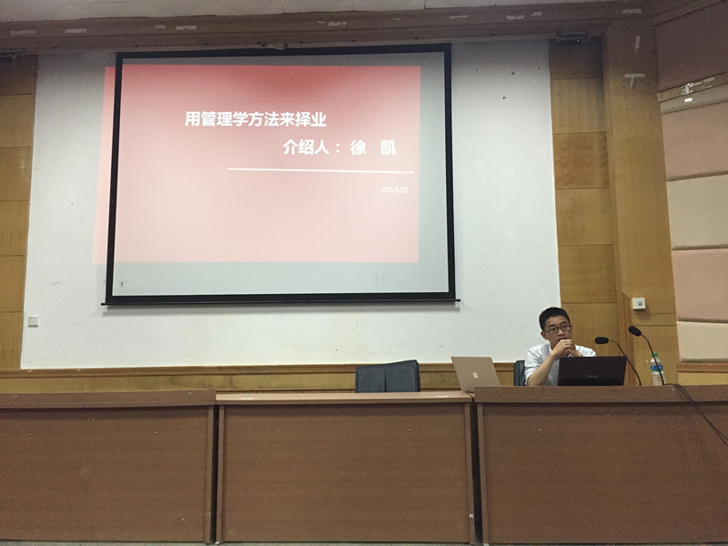 5月9日晚7点,在院科技馆报告厅,学院邀请到了2001级优秀校友、中国华皓控股集团济南建信置业有限公司总经理助理徐凯为学院2012级大学生做《用管理学方法来择业》的就业指导讲座,学工办程建华老师主持讲座。
