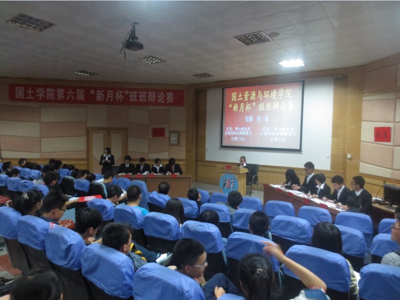 党委副书记黄新志致开幕词,他指出辩论不仅能活跃校园文化气氛,丰富学生的课余生活,促进思想交流;更能培养和提高同学们的逻辑分析、辩证思考能力和团队精神,激发和活跃我院长期保持的良好学术氛围。并预祝此次比赛获得圆满成功。今天的初赛第一场是由正方土管1102班对阵反方土管1101班,其中正方辩题为“劳心者比劳力者对社会贡献更大”,反方辩题为“劳力者比劳心者对社会贡献更大”。经过知己知彼、有问必答、面授机宜、短兵相接、烽火再起和一锤定音六个环节的激烈比拼,比赛告一段落,评委离席讨论。但是比赛的会场仍然热火朝天,观众的提问也一样咄咄逼人。最后,正方土管1102班以439比429的比分险胜反方土管1101班,获得此次比赛的胜利,同时正方三辩刘庆芳获得本场优秀辩手的称号。