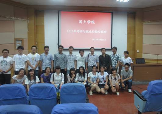 5月21日晚七点,国土学院2013年考研就业交流会在科技馆报告厅顺利举行。副院长陈文波教授出席会议。土管091班黄丽华,旅游091班李青茂,环科091龚超禹、王亮,环工091班杨乐,资环091班张炜、许健等七位09级同学参与到交流会中。会议由谭会乐老师主持。