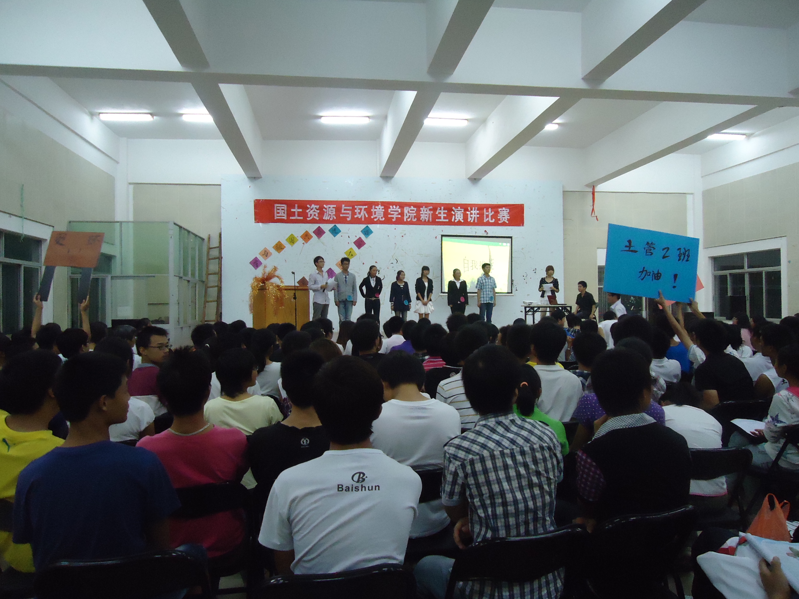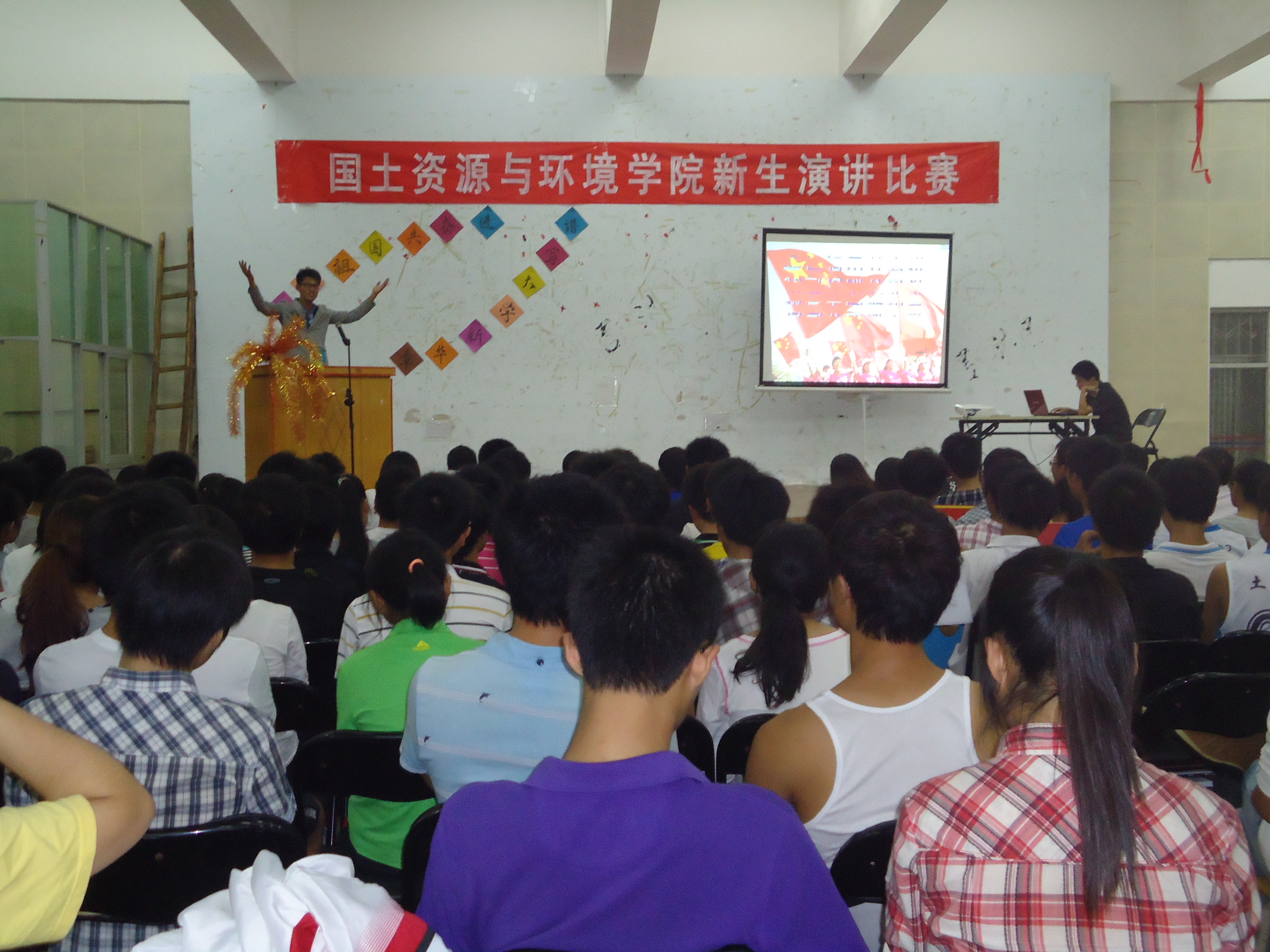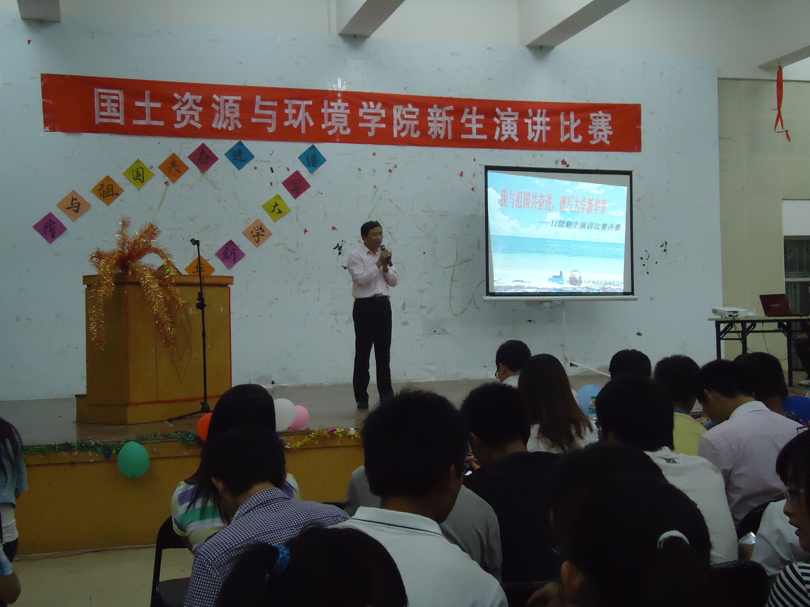 本报讯(曾加会)10月11日晚7点至9点,由院团委学生会宣传信息部主办的以“我与祖国共奋进,谱写大学新华章”为主题的新生演讲比赛的决赛在大学生活动中心501顺利举行。来到比赛现场的嘉宾有我院团委书记郭细根,学工办谭会乐、程建华老师,我院10级新生演讲比赛最佳口才奖获得者徐凯旋以及各院宣传部部长。此次大赛还邀请到校宣传部部长许霞,广播站站长助理余婧,501演讲与口才协会负责人薛雅文,话剧团团长付俊华,我院10级新生演讲比赛冠军侯耀辉担任评委。
