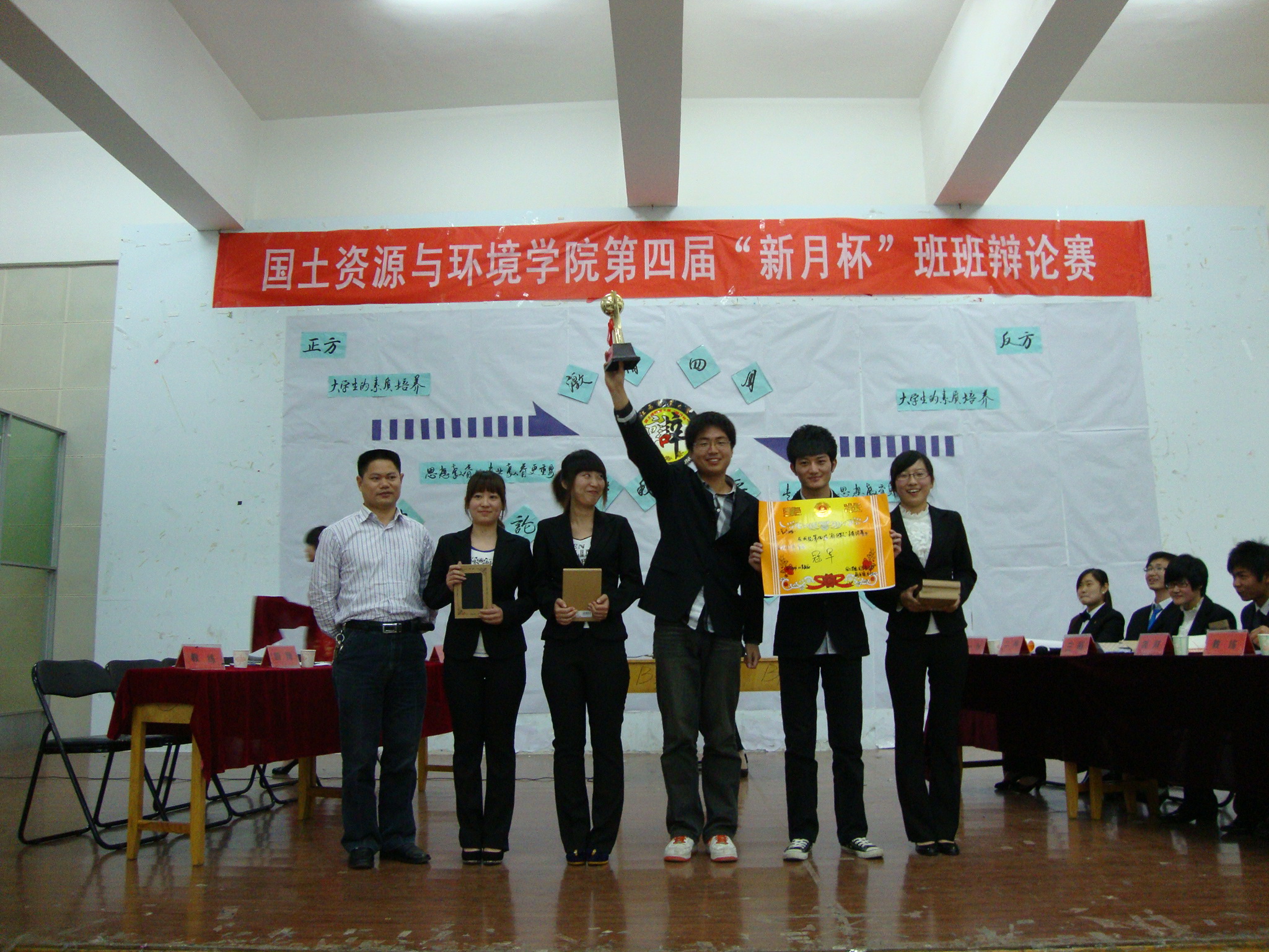 本报讯(赖婷珍 谢良梅 陈自松)4月19日晚,由国土学院团学宣传部和新月读书社联合举办的第四届“新月杯”班班辩论赛决赛在大学生活动中心501成功举行。担任本次决赛的评委有我校学生会社联秘书处秘书长陈家兴老师、旅游教研室沈尧老师、理学院学生会团委副书记张辉、校学生会宣传部部长许霞和我院学生会主席张小清。另有我院党委副书记蔡海生,团委书记郭细根,学工办老师谭会乐以及各院各兄弟社团作为嘉宾出席。土管091班周文丹担任本次决赛主席。