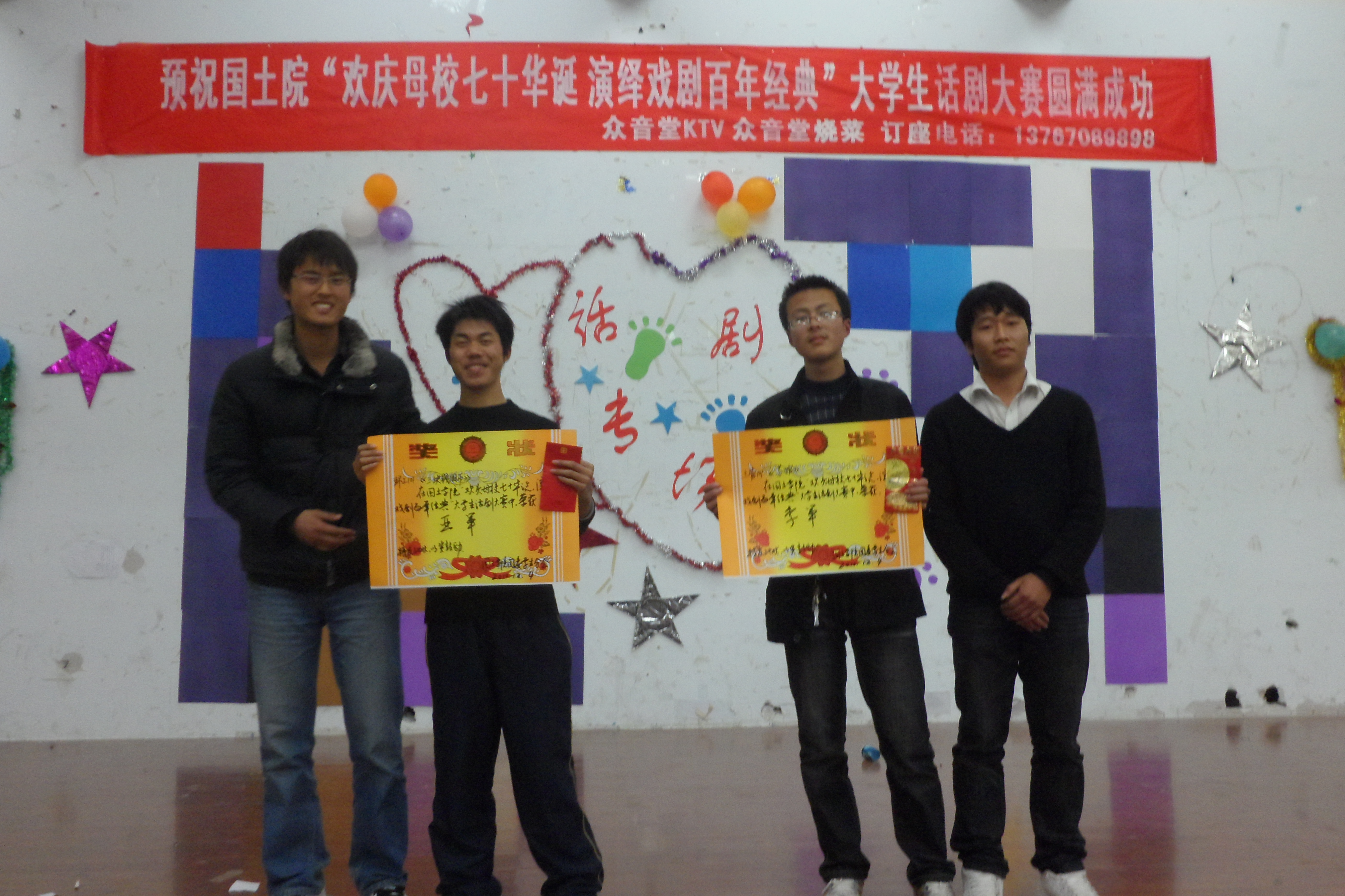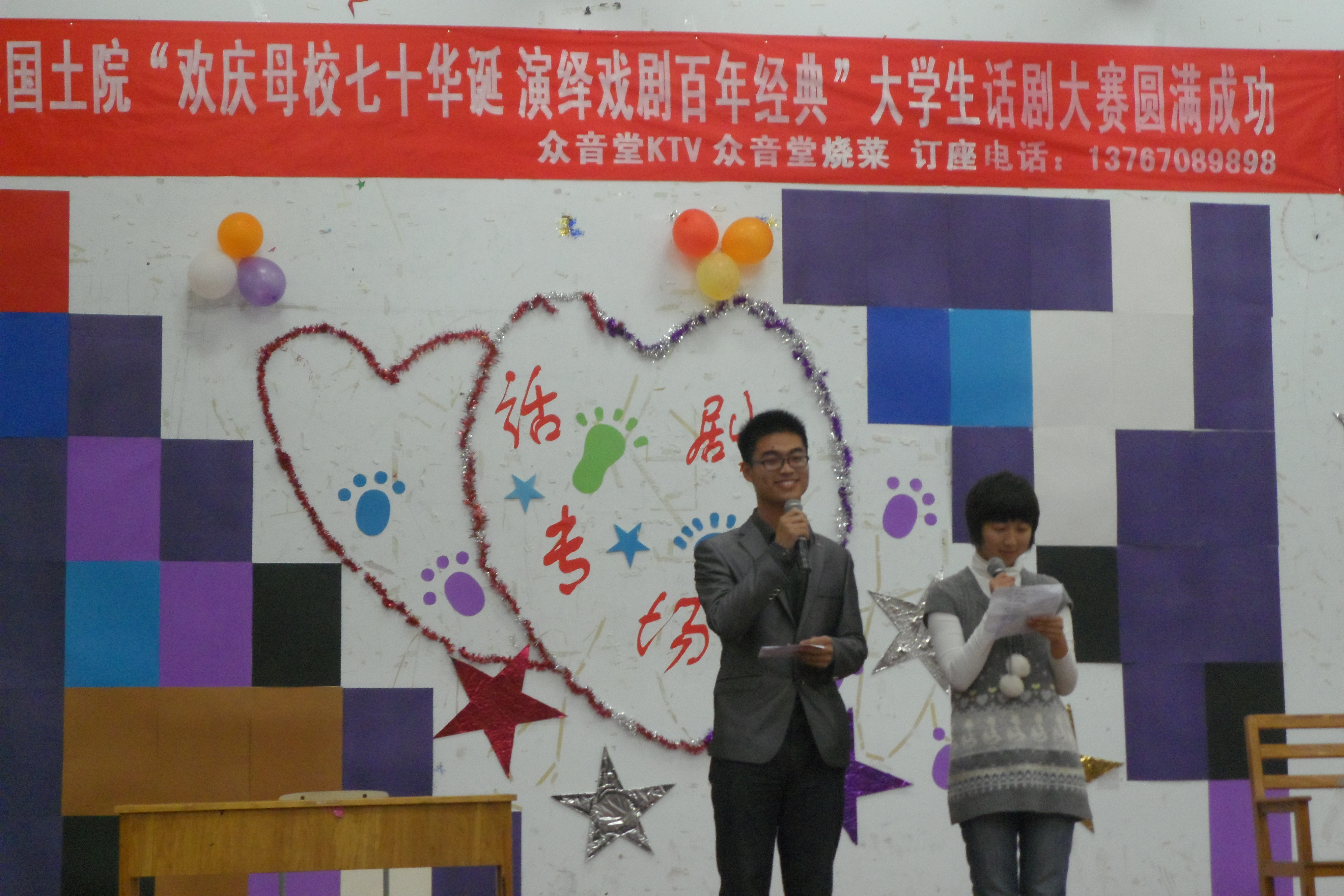 本报讯(谢良梅)12月4日晚7点,大学生活动中心热闹非凡,由国土院团委新月读书社和文艺部联合主办的以“欢庆母校七十华诞,演绎戏剧百年经典”为主题的话剧大赛在此拉开帷幕。本次大赛特别邀请了501演讲协会话剧团团长付俊华,副团长兼校外联部部长刘熠民,校文艺部副部长谯蕤宸,工学院阳光演艺团相声小品部前任部长丁宁芳,国土院新月读书社前任社长马轶欣担任评委,并盛情邀请了校学生会、社团联合会秘书长陈家兴老师、国土院团委副书记郭细根老师、国土院学工办谭会乐老师、各班班主任和校学生会主席孙萌等人出席本次大赛。张秋翔和卫倩茹担任主持人。