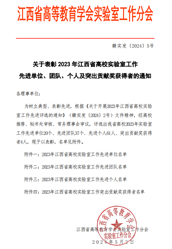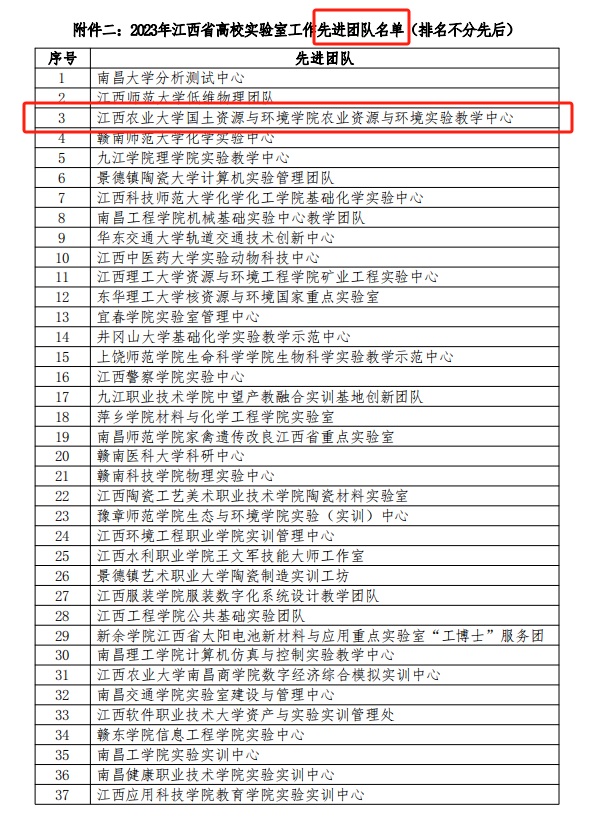 近日,从江西省高等教育学会获悉,我院农业资源与环境实验教学中心经学校推荐、江西省高等教育学会秘书处审核、常务理事会审议,荣获“2023年江西省高校实验室工作先进团队”称号。