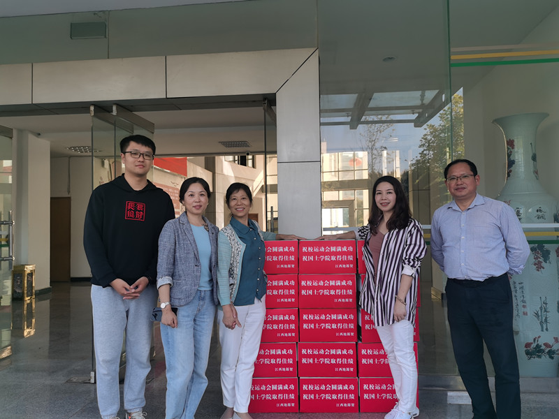 10月17日下午,江西地源土地房地产评估规划测绘有限公司行政及人力资源部阮惠珍主任一行代表公司向学院捐赠100箱运动会用水,预祝学院取得佳绩。