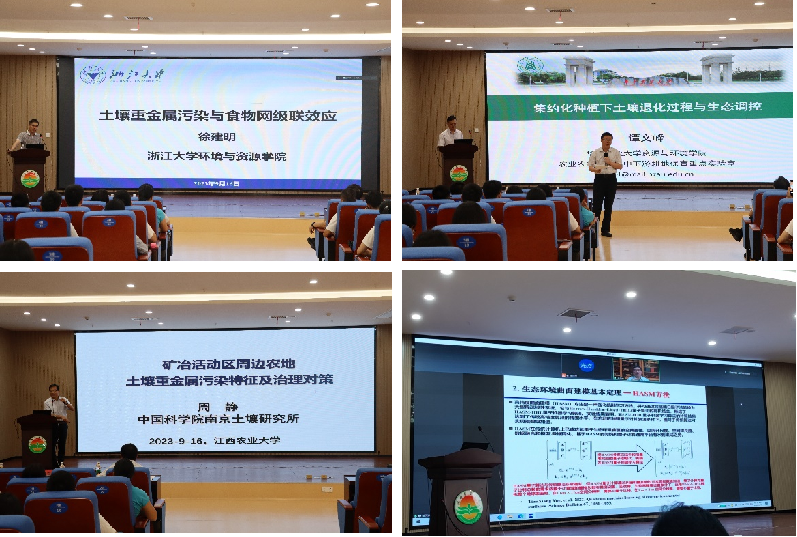 此次学术论坛,邀请了浙江大学徐建明教授、华中农业大学的谭文峰教授、中国科学院南京土壤研究所的周静研究员和中国科学院地理科学与资源研究所的岳天祥研究员等四位专家做特约报告。徐建明教授在报告中介绍了土壤重金属污染的生态风险,强调了土壤食物网的生态角色,阐明了重金属对土壤微食物网的潜在影响。谭文峰教授通过介绍长江流域最为全球集约化种植强度最大区域的背景为出发点,从土壤微生物多样性、酶化学计量学、土壤磷、氮循环探究了集约化种植下土壤退化的过程。周静研究员详细地介绍了农田重金属污染精准防治的几项重大科研成果,最后提出了土壤污染防治能够进一步深入开展所存在的问题与思考。岳天祥研究员从修正高精度曲面建模出发,提出基于组织的碳核查遥感方法和体系,为节能减排的精细化管理与决策提供技术手段。
