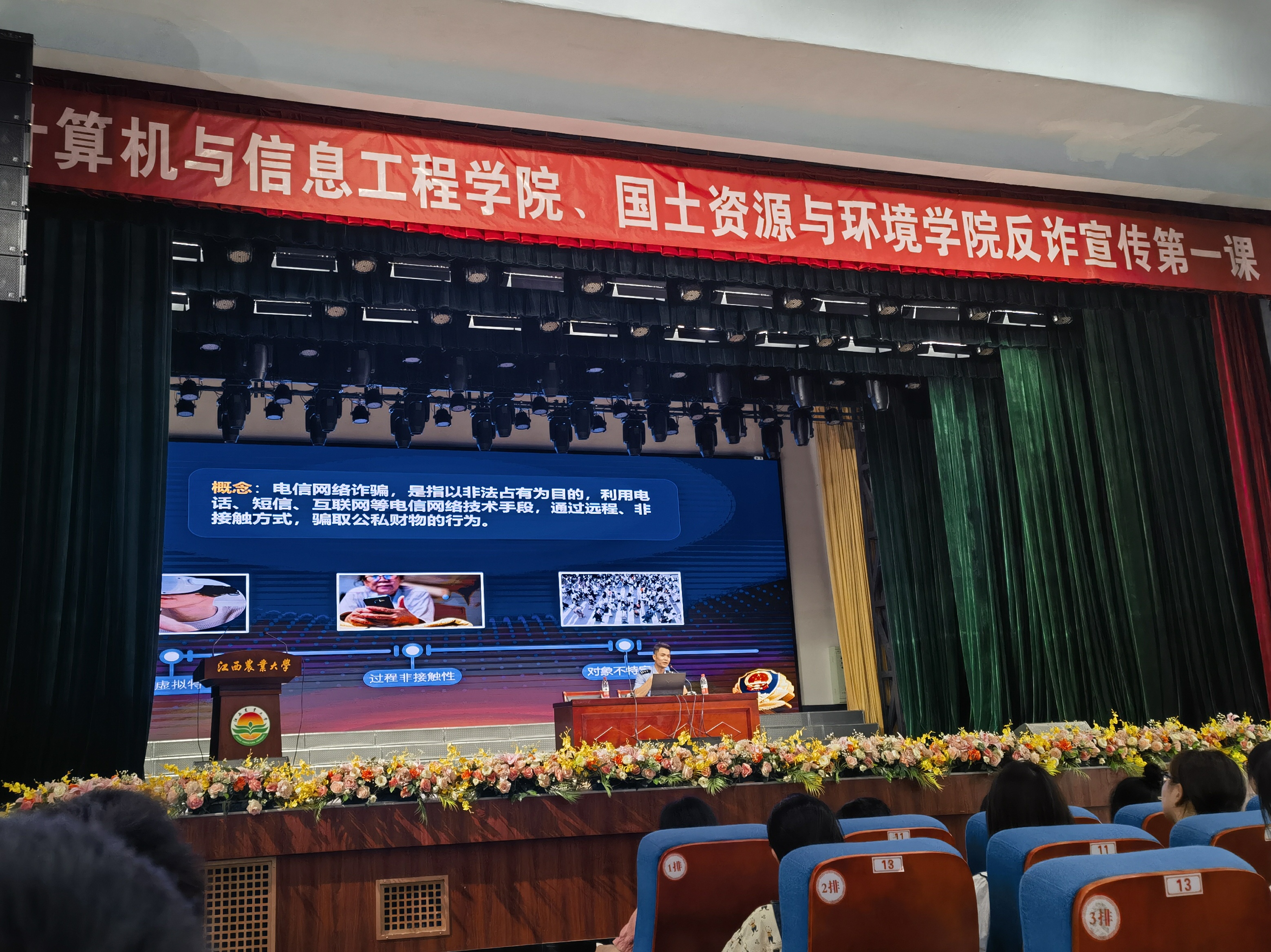 开展“安全教育”,把牢校园安全红线。为深化防范电信网络诈骗宣传教育工作,从源头上筑牢新生反诈意识,构建平安和谐校园环境,9月11日,学院开展新生反诈第一课,特邀请南昌市公安局反诈讲师团徐加明警官给2023级新生讲解反诈知识。通过以案说法的方式向在场同学们展现了常见的诈骗套路、手段以及如何应对的措施、方法,引导同学们做到“不听、不信、不转账”,筑牢反诈“防火墙”,守好自身“钱袋子”。