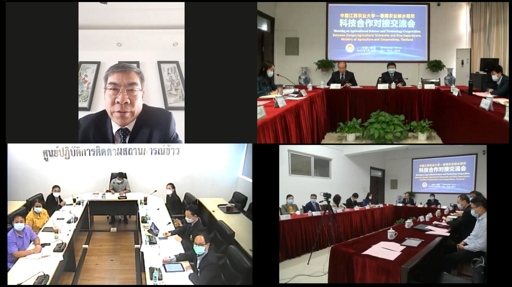 为促进科研对外交流合作,提升学校国家化办学水平,响应“一带一路”倡议,3月18日上午,我校与泰国农业合作部水稻司、朱拉隆功大学及川登喜皇家大学以视频连线的方式召开科技合作对接交流会。校领导赵小敏、刘木华,江西省科技厅副厅长鄢帮有出席现场会议,国土学院院长周春火、国际交流处、科技处及相关学院领导参加会议。泰方参会人员包括泰国农业合作部水稻司水稻政策与战略局局长Chitsanaucha Buddhabun、朱拉隆功大学代表Prasert Reubroycharoen、川登喜皇家大学代表Wittawat Ratanathavorn、泰国水稻研究所教授Sutas Janbula等。会议由副校长刘木华主持。