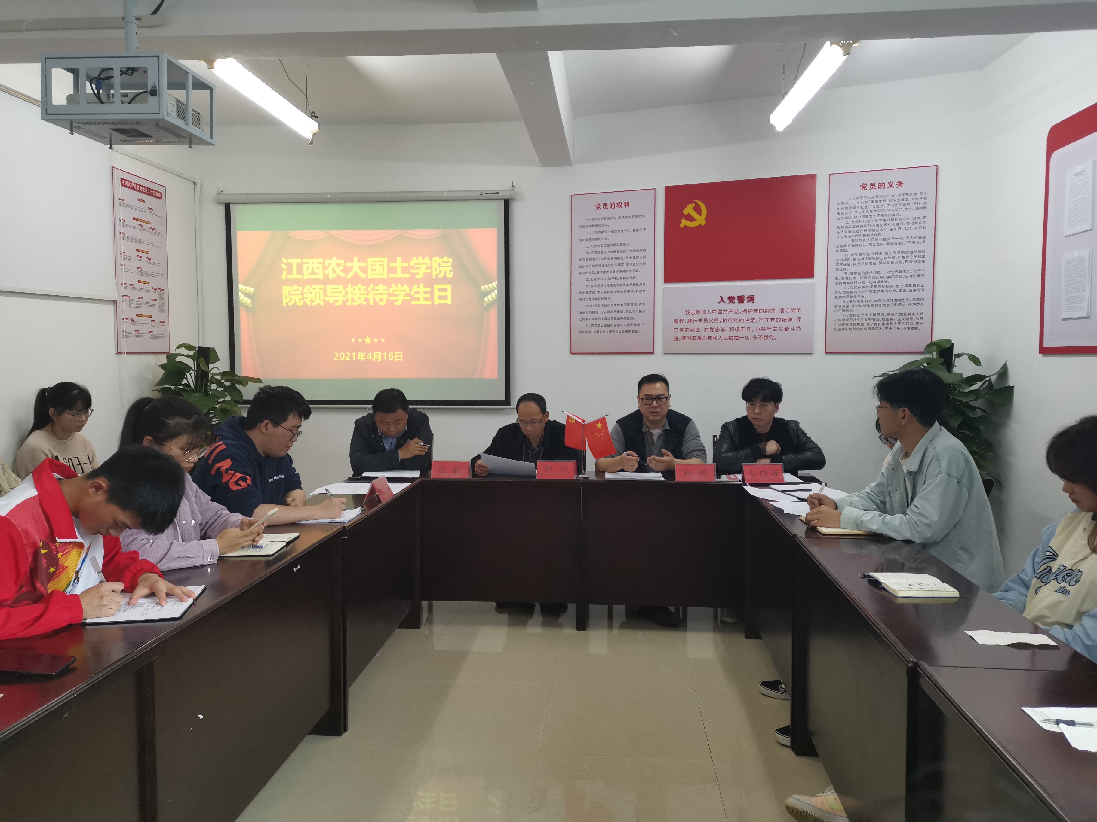 为贯彻落实“我为群众办实事”党史学习教育实践活动要求,4月16日下午,国土学院开展了2021年第一期院领导接待日活动。院党委书记郭旭,党委副书记赵刚,副院长张嵚,院学工办、行政办老师及各班级代表参加接待日活动。