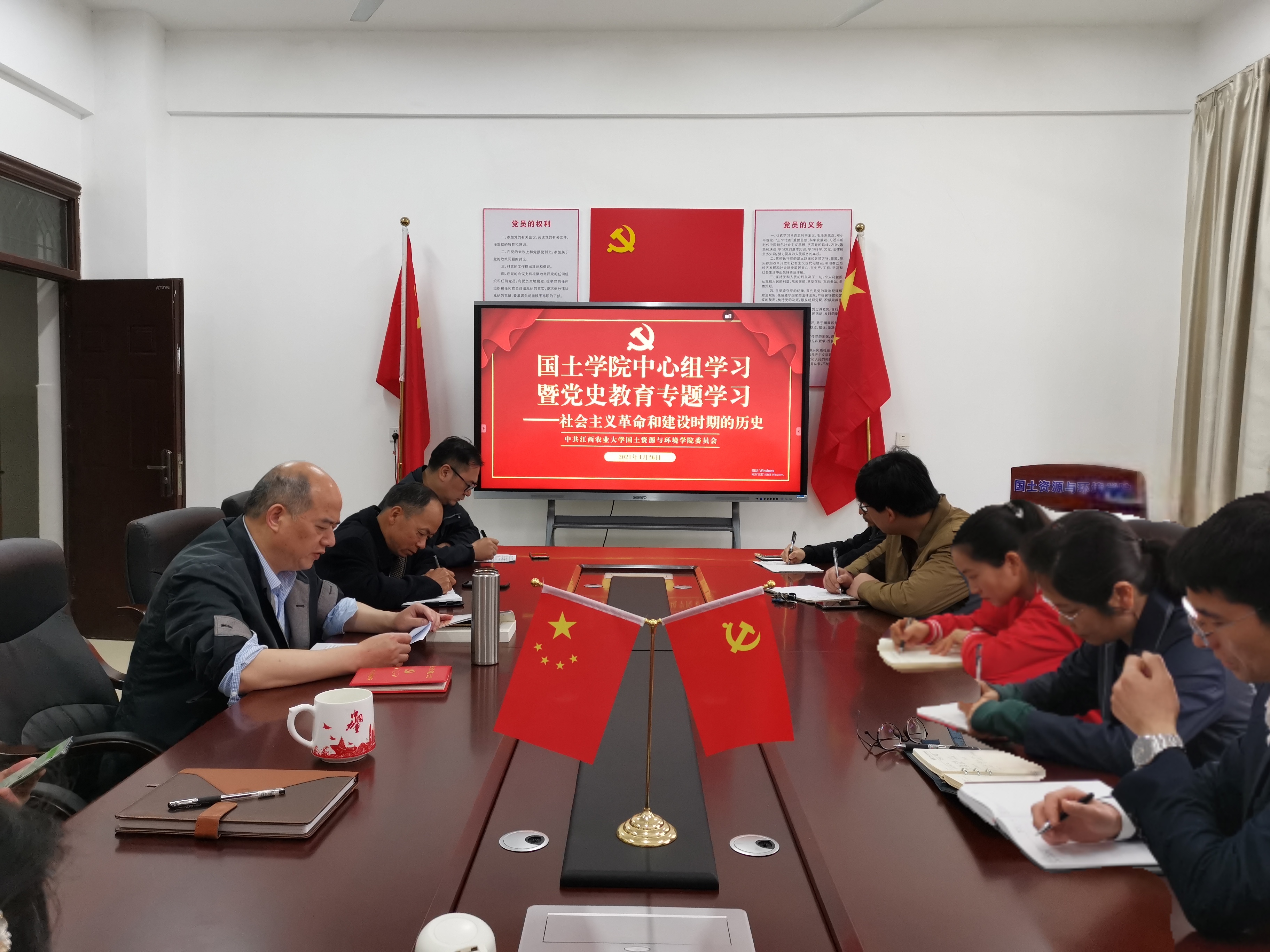 4月26日,国土学院党委召开理论中心组暨党史学习教育专题学习——社会主义革命和建设时期的历史。国土学院党委委员、各党支部书记、系主任参加会议,副院长周春火、江西省鄱阳湖流域农业资源与生态重点实验室副主任郭熙、工会主席肖远东列席会议,会议由院党委书记郭旭主持。