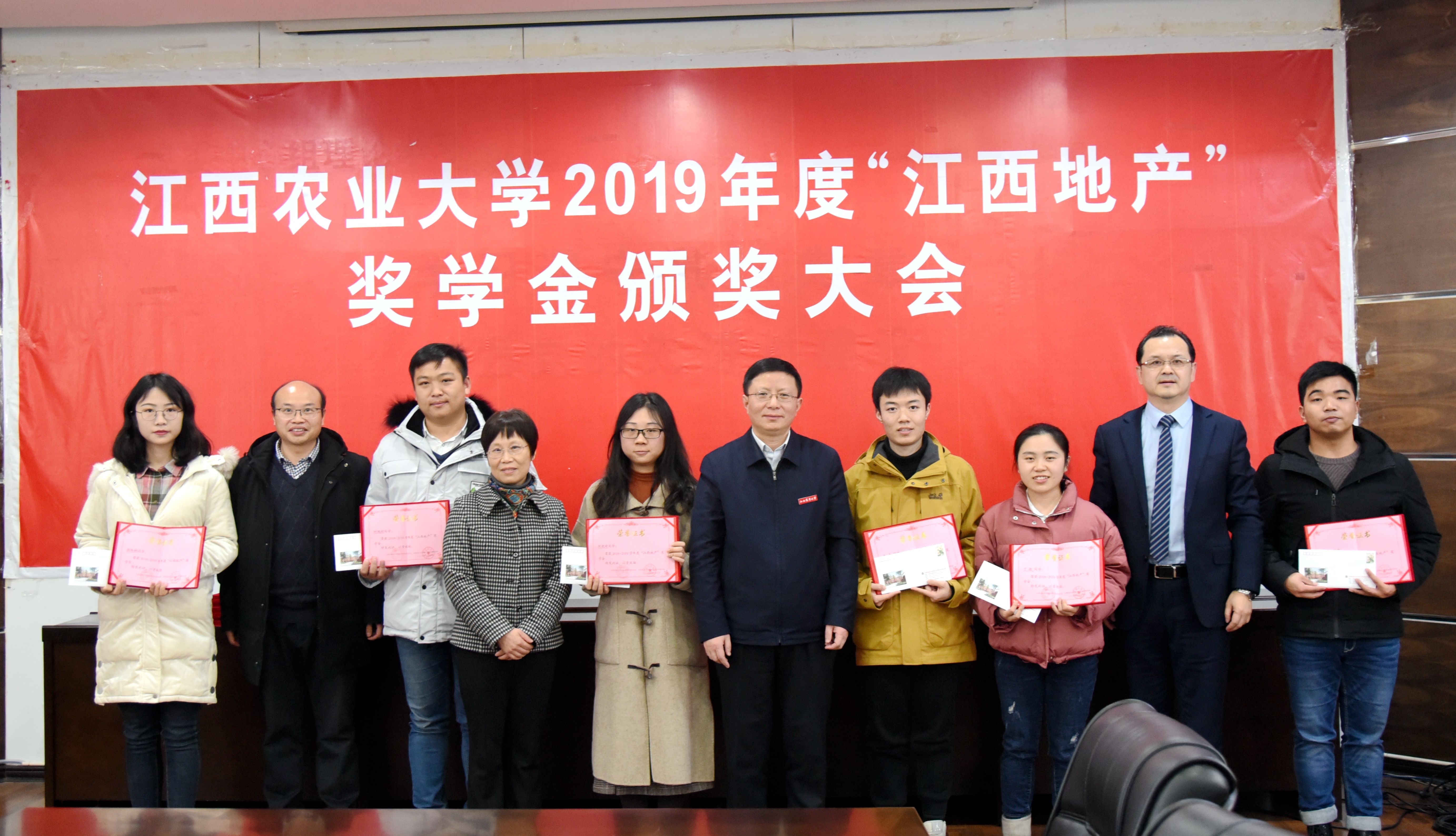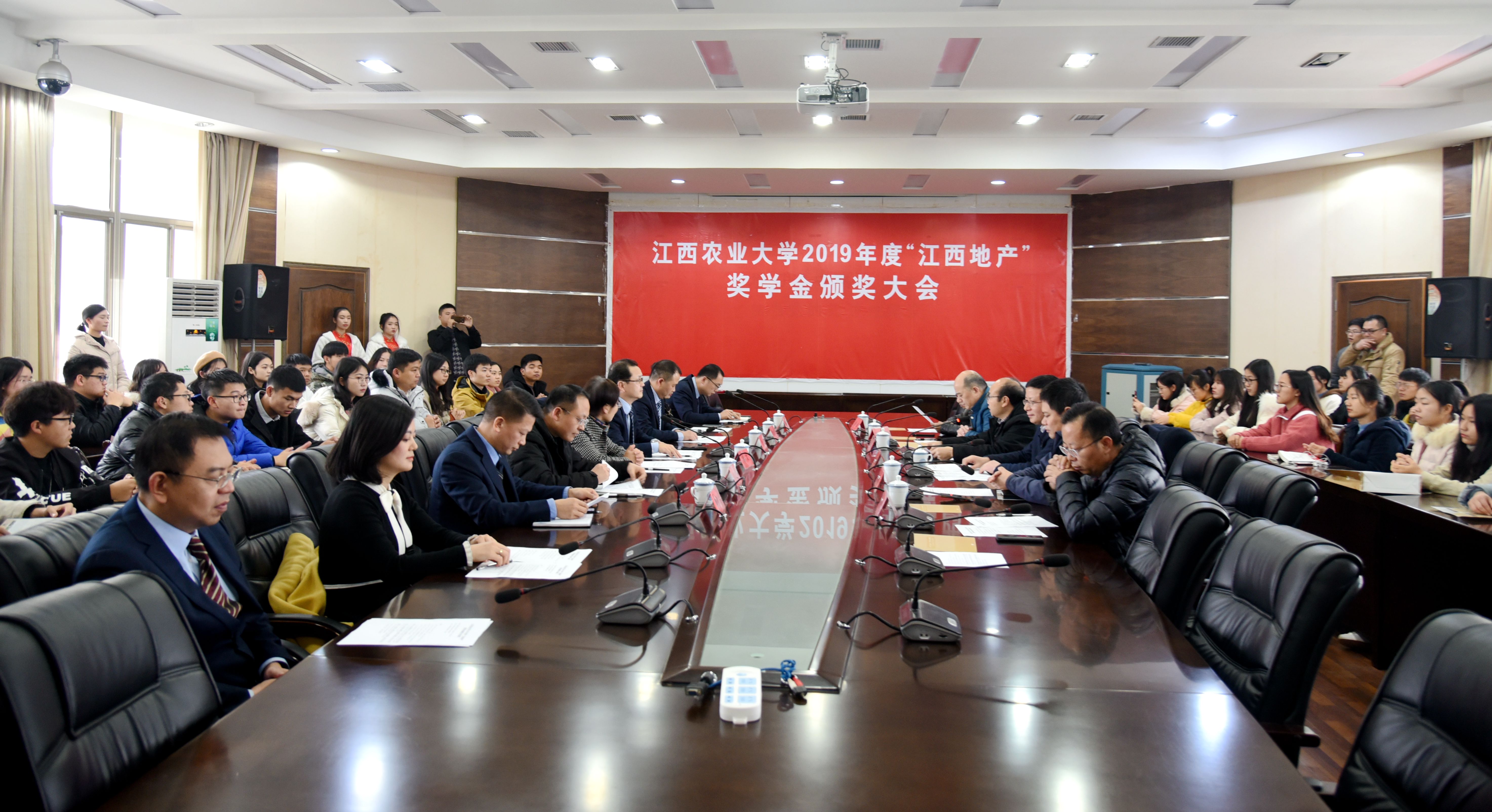 1月3日下午,江西农业大学2019年度“江西地产”奖学金颁奖大会在校办公楼2楼会议室隆重举行。江西大成国资公司党委书记、董事长项文;江西大成国资公司党委办公室主任、董事会办公室主任、综合管理部总经理郭江槐;江西省地产开发集团党委书记、董事长龙兵;江西省地产开发集团党委委员、总经理盛振青;江西省地产开发集团党委委员、副总经理吴其生;江西省地产开发集团党委委员、副总经理文翠玉及地产开发集团中层干部职工代表来我校参加颁奖大会。我校校长赵小敏、副校长刘木华、研究生院院长蔡海生、学工处处长李剑富、国土学院党委书记郭旭、国土学院院长李保同等出席颁奖大会,获奖的22名研究生、本科生同学和部分本科学生代表90余人参加颁奖大会,副校长刘木华主持颁奖大会。