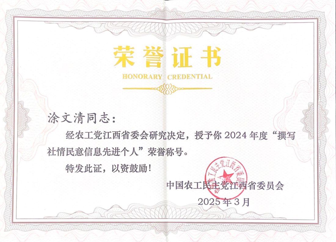 近日,中国农工民主党江西省第十三届委员会第四次全体会议在南昌召开。会议表彰了2024年度农工党江西省市级组织综合评价先进集体、“优秀支部”评选工作和反映社情民意信息工作先进集体、先进个人。国土学院院长、省政协常委、农工党江西省委会委员涂文清荣获“撰写社情民意信息先进个人”称号。