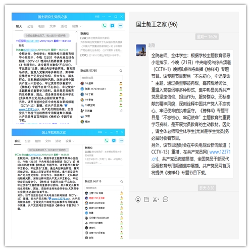 接到“不忘初心、牢记使命”主题教育领导小组发布关于认真做好《榜样4》专题节目学习收看工作的通知后我院领导高度重视,即刻在院教职工群、本科党员群、研究生党员群里发出通知要求全员师生收看节目,并电话通知至各党支部书记,要求广泛发动师生党员、学生干部通过电视端、网络端等渠道及时收看并发表个人感悟,撰写观后感和心得体会,并及时拍摄观看照片。