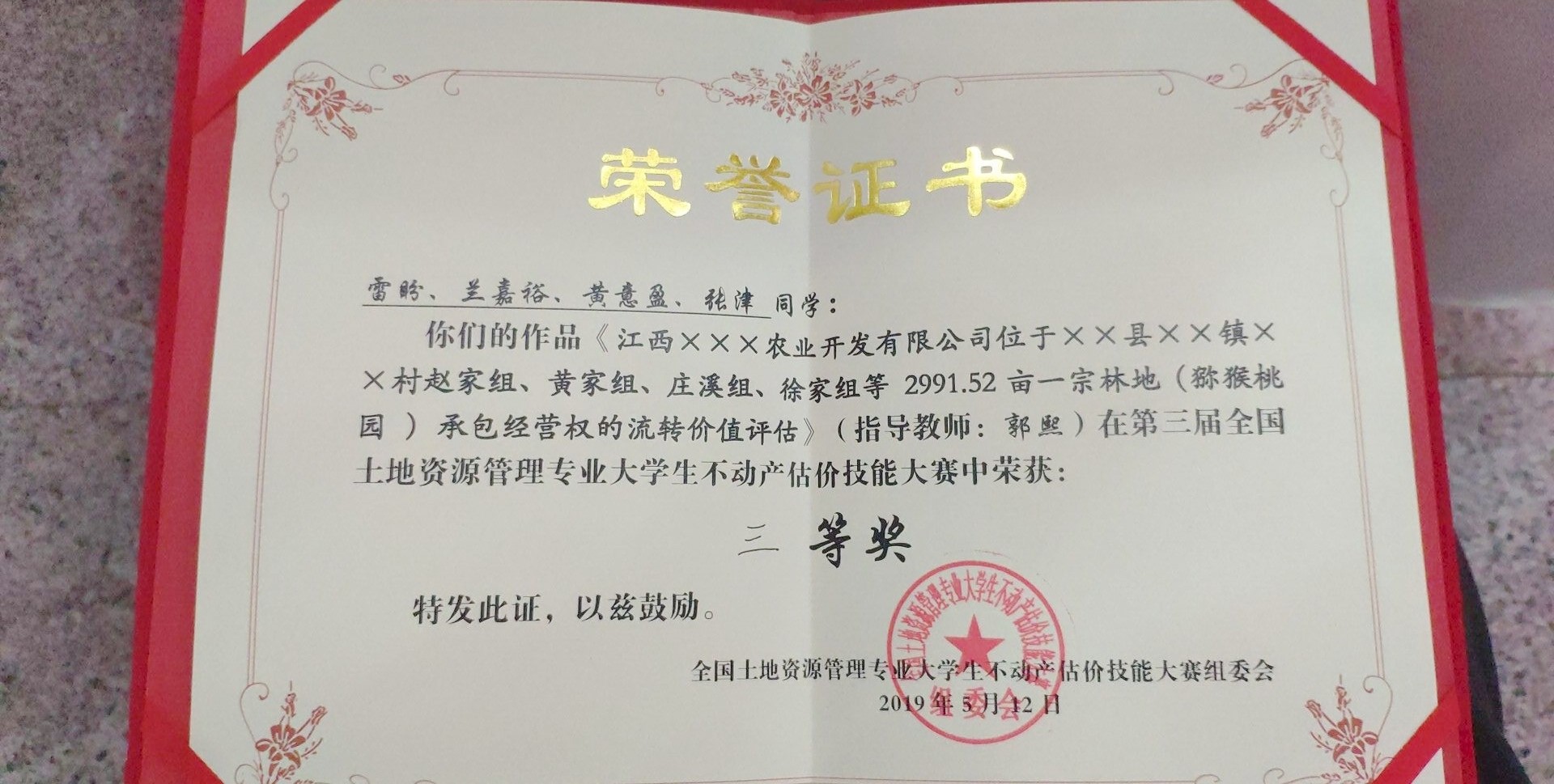 5月11日,第三届全国大学生不动产估价技能大赛在中国矿业大学举行,我院土地资源管理1601班的雷盼、兰嘉裕、黄意盈、张津四位学生的《江西XX农业开发有限公司位于XX县XX镇XX村赵家组、黄家组、庄溪组、徐家组等2991.52亩一宗林地(猕猴桃园)承包经营权的流转价值评估》作品,经过层层选拔,从全国各大高校的优秀作品中脱颖而出,荣获此次大赛的三等奖。