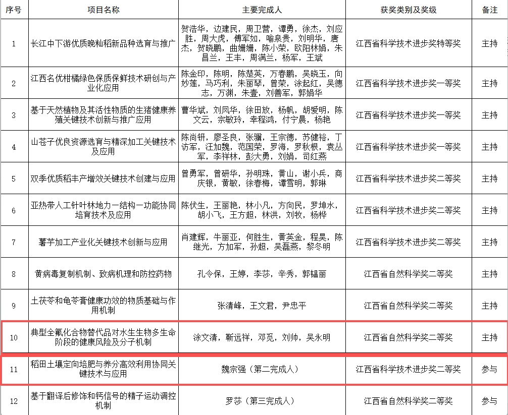 日前,江西省人民政府发布《关于2024年度江西省科学技术奖励的决定》。在本年度全省科学技术奖励评选中,我院科研团队再创佳绩:涂文清老师团队荣获江西省自然科学奖二等奖,魏宗强老师作为第二完成人荣获江西省科学技术进步奖二等奖。