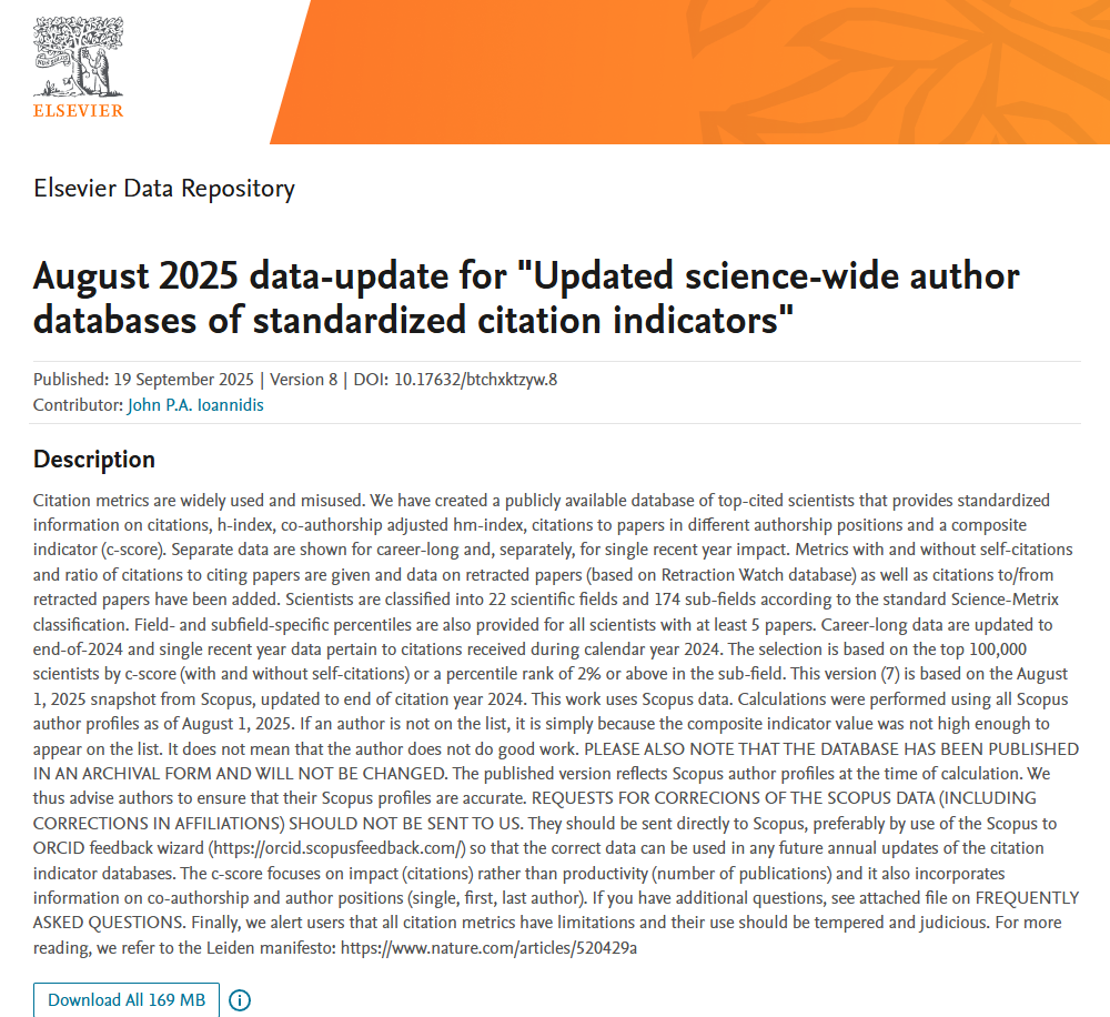 近日,爱思唯尔(Elsevier)与美国斯坦福大学(Stanford University)联合发布了最新一期《世界前2%顶尖科学家榜单》(World's Top 2% Scientists),学院黄华军老师榜上有名。