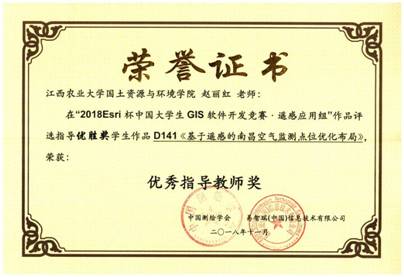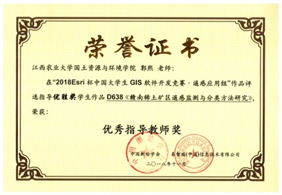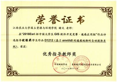 近日,由中国测绘地理信息学会主办、Esri中国信息技术有限公司承办的“2018Esri杯中国大学生GIS软件开发竞赛”获奖名单公布,来自国土学院地理信息科学专业的三组队伍从72组参赛队伍中脱颖而出,均获得此次竞赛遥感应用组的优胜奖,这也是我院学生在该大赛连续第三年获奖。三组作品分别是由郭熙老师指导的“赣南稀土矿区遥感监测与分类方法研究”(小组成员为赖宗明,闵锋,涂贤达,龙鹏),谢文老师指导的“基于ENVI/IDL的遥感地物的自动提取系统”(小组成员为李佳裕,余霖,陈端怡,晏新程),赵丽红老师指导的“基于遥感的南昌空气监测点位优化布局” (小组成员为李顺清,王弘宇,李国泽,晏艳琴)。