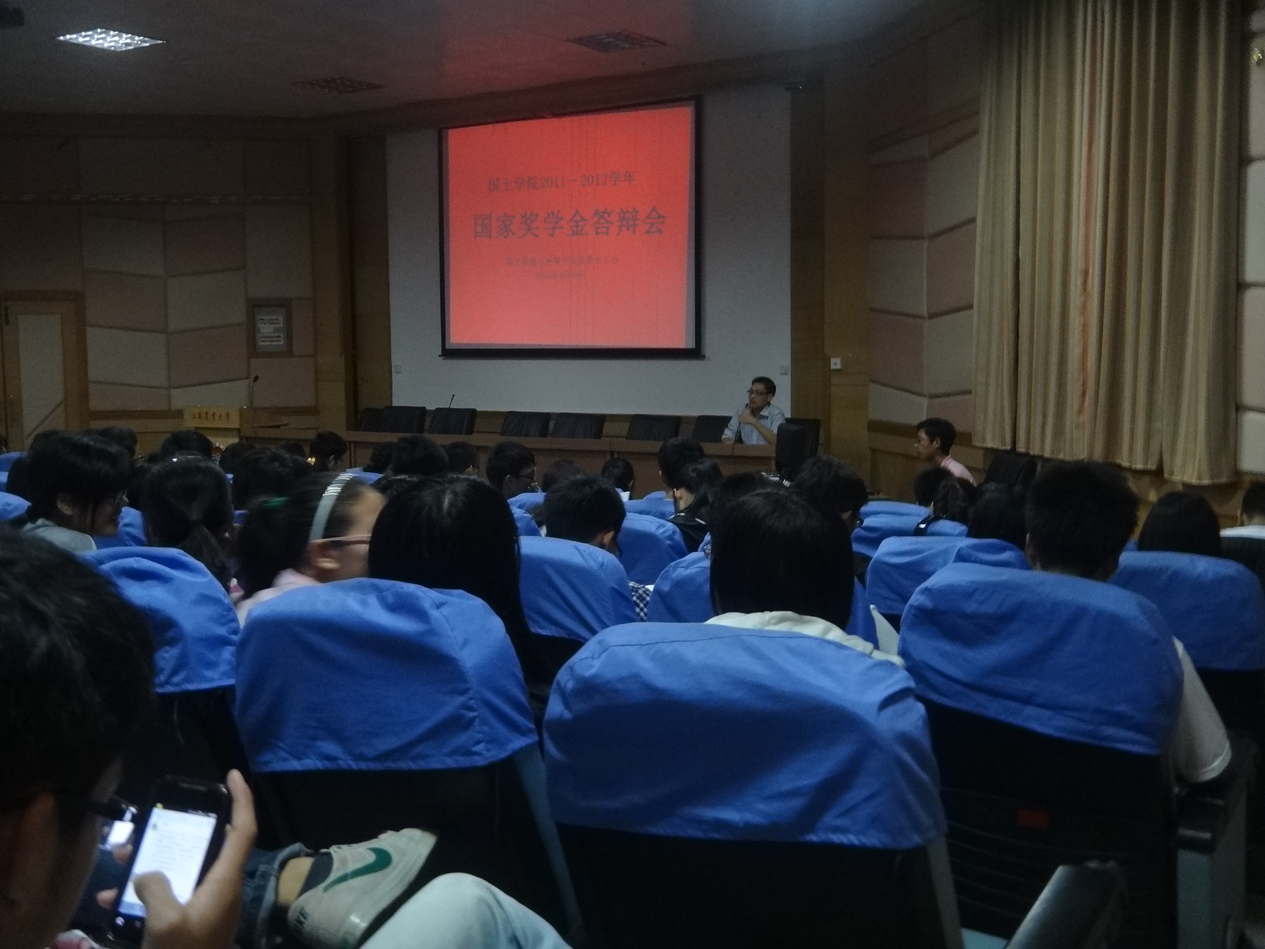 10月9日晚,我院2012年国家奖学金答辩会在科技馆报告厅隆重举行。院党委副书记黄新志,学工办老师谭会乐出席了本场答辩会。此外,参与竞选的十一位选手和院团学委员以及各班代表也参加了此次答辩会,场内座无虚席。