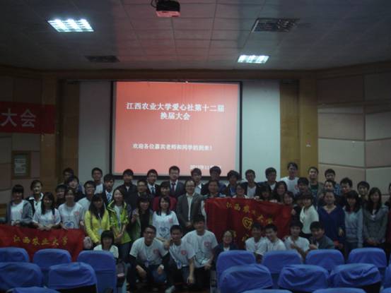 本报讯(毛波发)11月4号下午两点,江西农业大学爱心社第十二届换届大会在科技馆报告厅隆重召开。出席本次大会的有国土院党委副书记黄新志、校团委老师屈婧、国土院团委书记郭细根、院指导老师谭会乐、社团联合会代表以及兄弟社团代表。此外,参加此次会议的还有爱心社上一届老部长们,本次大会执行主席为爱心社副社长张莉,两百多新会员参与本次大会。