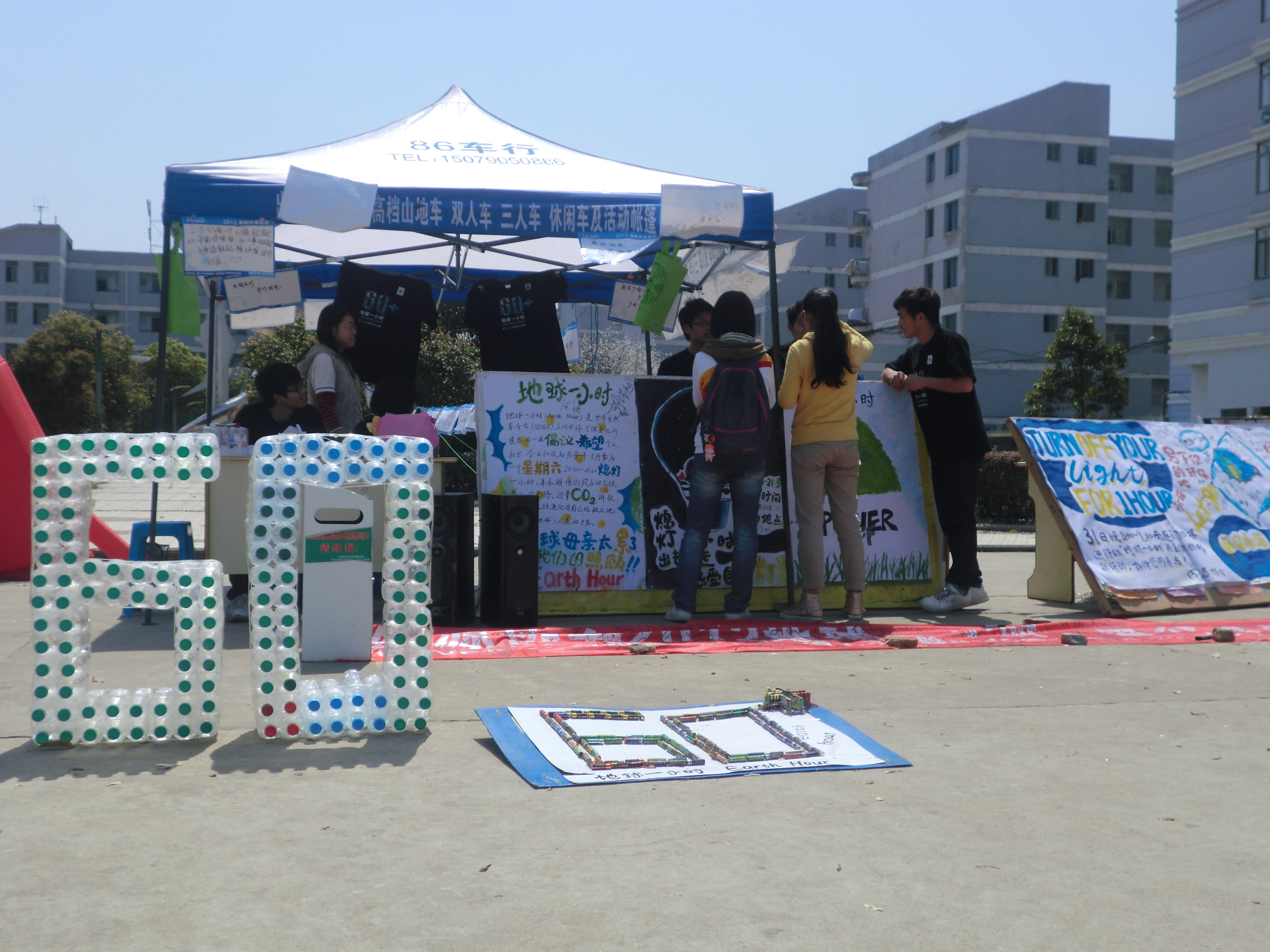 在省团委,校团委、国土学院团委、后勤集团等单位的大力支持下,在绿源协会环保志愿者的精心筹备下。活动前期,绿源协会在全校范围内进行广泛宣传,包括校园贴吧、微博、论坛等网络宣传方式,走访寝室、海报、展板、放映“地球一小时”宣传片等实地宣传方式。31日活动当天晚上,绿源协会会员在南区广场也开展了一系列活动吸引学生熄灭灯光、走出寝室参加地球一小时活动,并通过玩生态游戏来提高活动现场的环保热情,紧接着绿源协会会员代表带领大家宣读“地球一小时”活动倡议书将本次活动推向高潮,在距离熄灯还有一分钟的时候同学们开始熄灯倒计时,当大家齐声欢呼“0”时,南区的路灯在8:30准时熄灭,国土学院学生公寓楼也基本上都实现了熄灯一小时的美好愿景。在南区27栋,绿源协会会员们和国土学院团学干部齐心协力,通过控制灯光在墙面上打出了“60+”的字符造型。