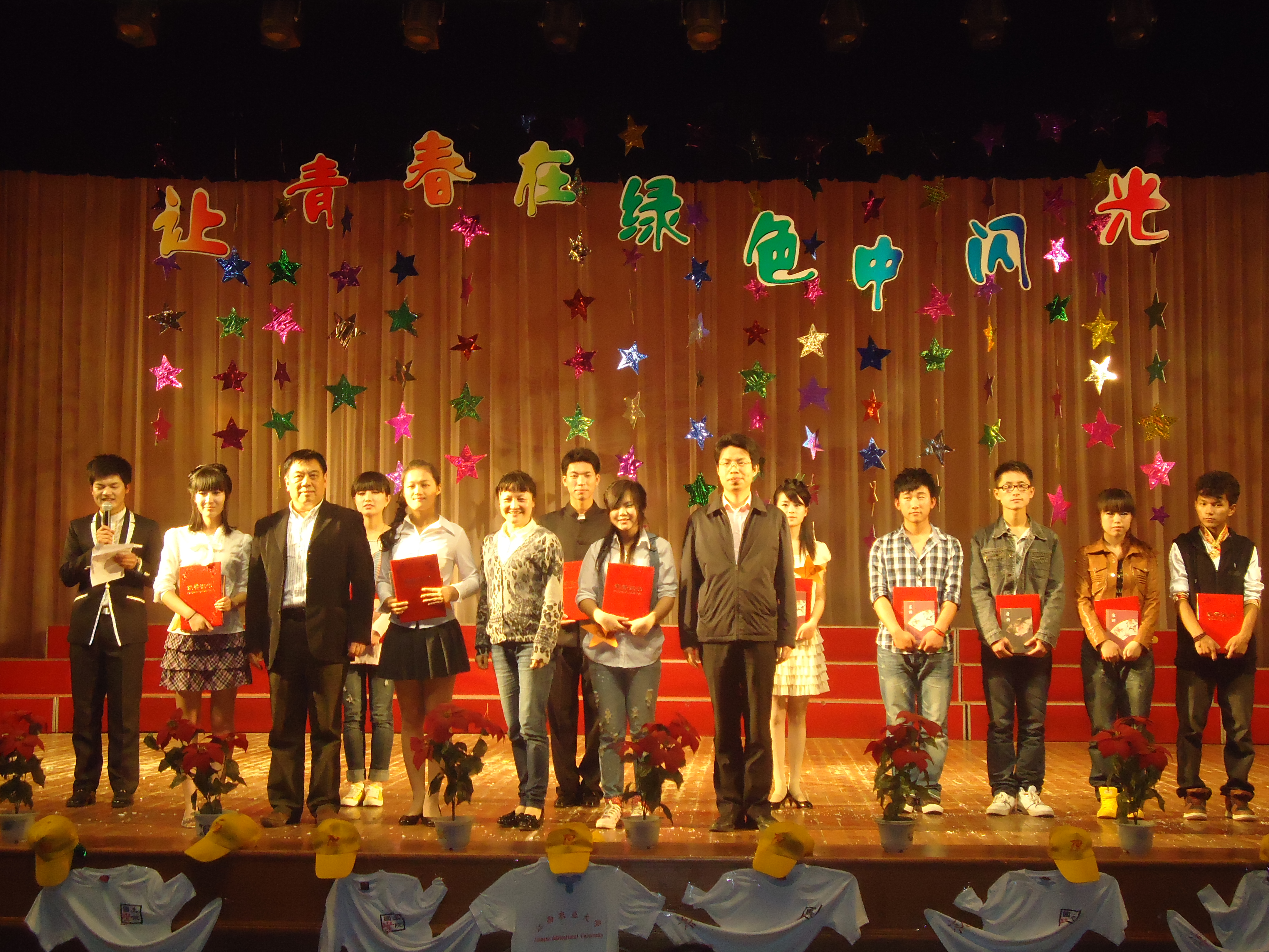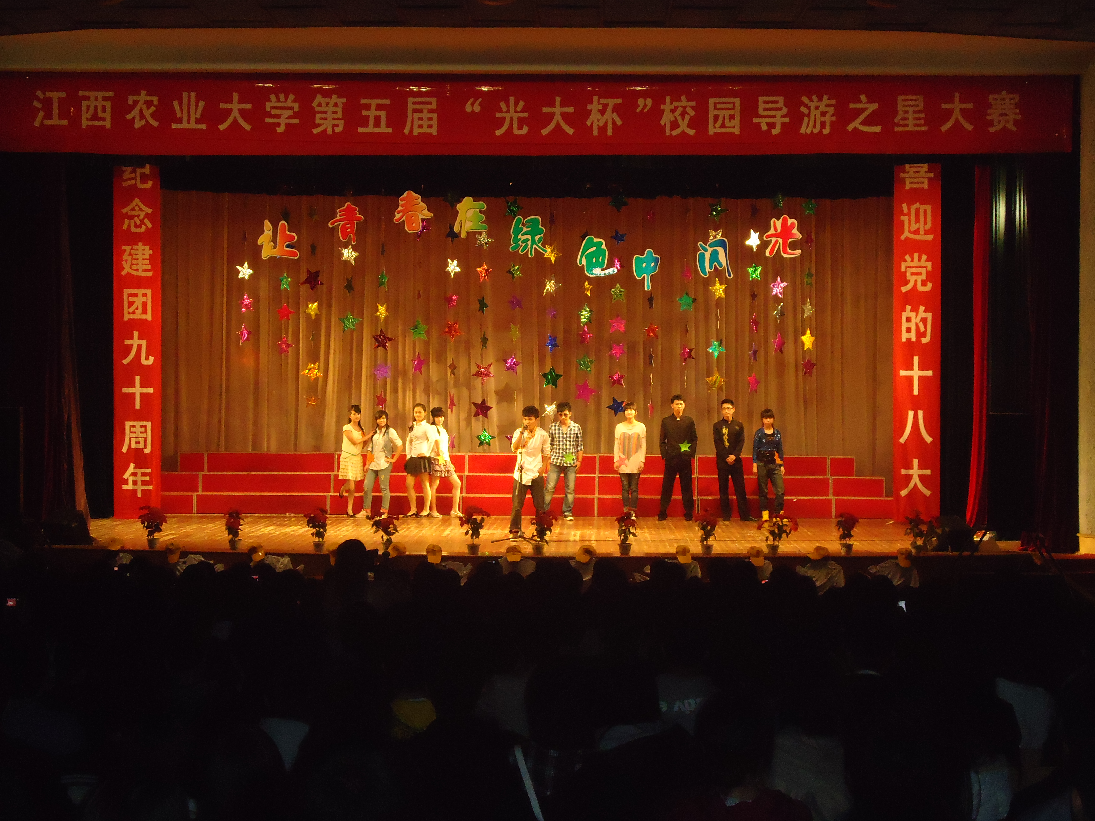 本报讯(刘祎娜 李晶晶) 2012年4月14日晚7点,由共青团江西农业大学委员会主办、国土资源与环境学院团委学生会承办的以“纪念建团九十周年,喜迎党的十八大,让青春在绿色中闪光”为主题的第五届“光大杯”校园导游之星决赛在校大礼堂隆重举行。莅临本次比赛现场的嘉宾有国土学院院长李保同教授、党委副书记黄新志老师、副院长陈文波教授。评委有旅游教研室主任胡明文教授,食品学院党委书记蔡海生教授,校团委副书记胡志坚老师,校党委宣传部副部长胡永生老师,江西光大国际旅行社董事长、南昌市旅游协会会长丁亚东先生,江西光大国际旅行社总经理、全国劳动模范、南昌市政协委员姜江女士,人文院团委书记陈小志老师。此外,各院学生会主席也来到了比赛现场。校大礼堂座无虚席。