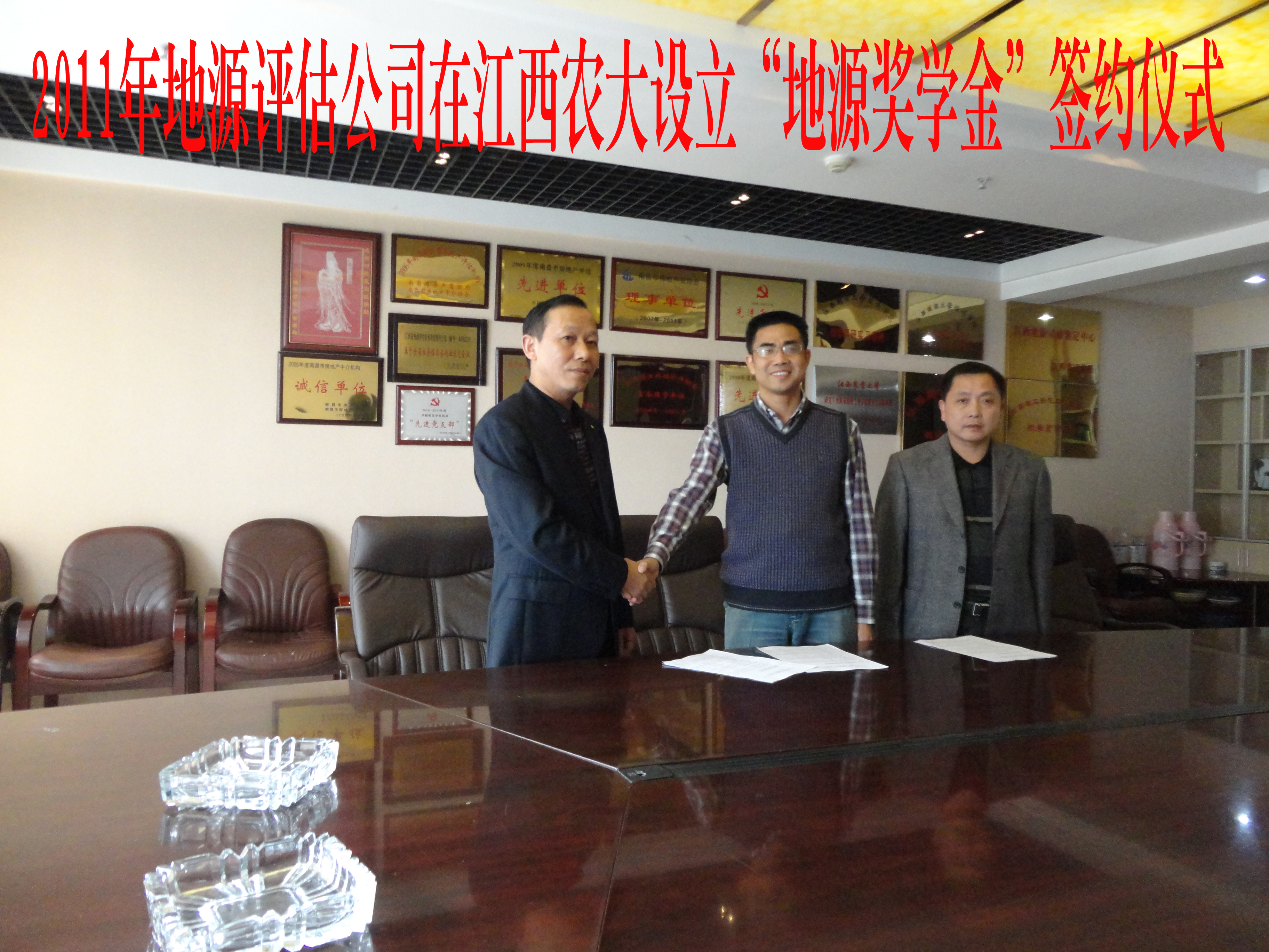 (本报讯)2011年11月16日上午,我校国土资源与环境学院陈美球院长与江西省地源评估咨询有限责任公司蒋总裁在地源公司总部续签《关于江西省地源评估咨询有限责任公司在江西农业大学国土资源与环境学院设立“地源奖学金”的协议书》。按协议书规定,从2011—2015年由地源评估公司每年出资壹万元奖励十名品学兼优的国土学院在校本科学生,每人奖金壹千元,每年评选一次。