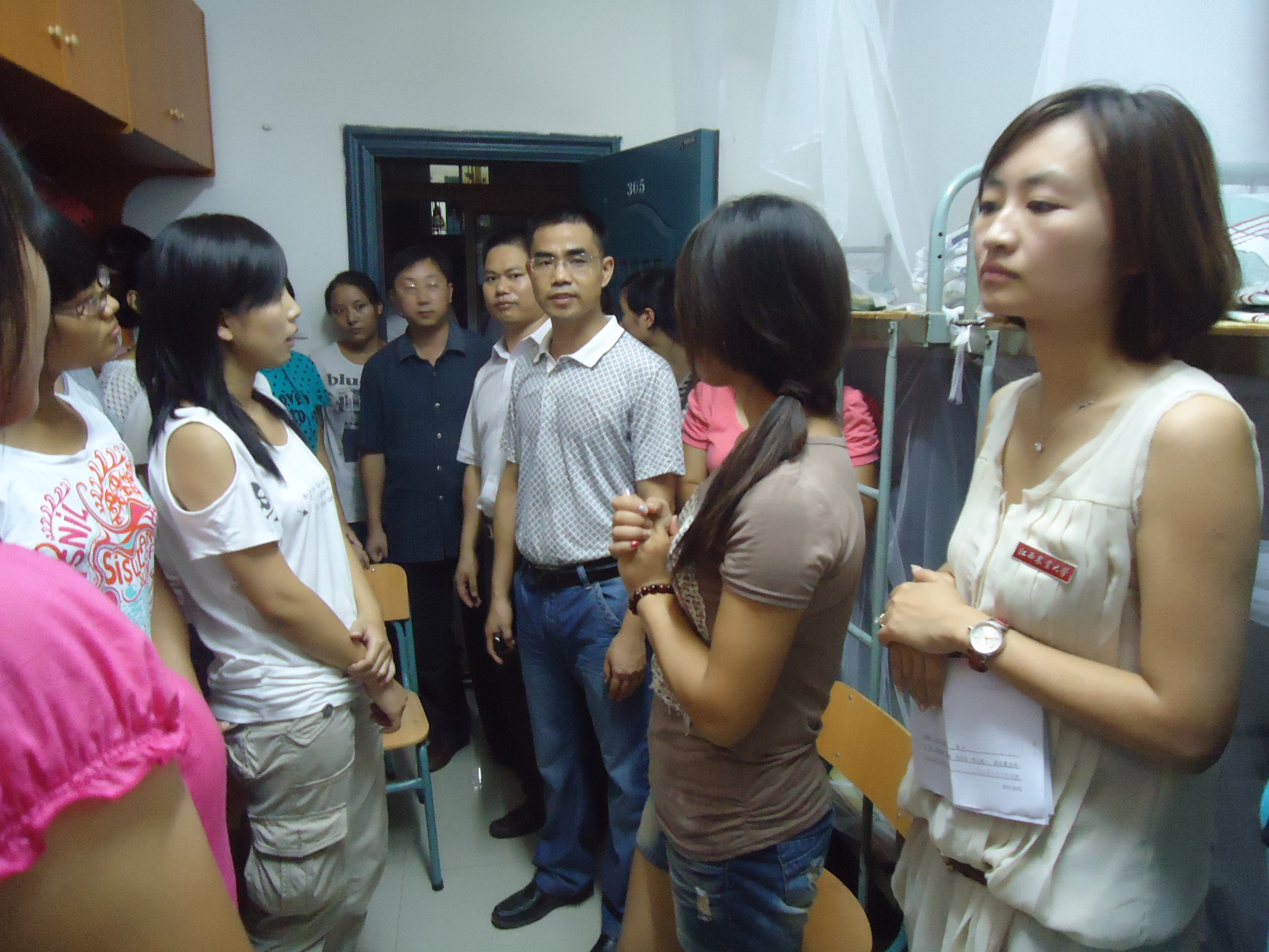 新生们都以热烈的掌声对院领导们的到来表示欢迎。领导们向各班班主任及辅导员了解了新生的到校情况,还向新生们征集关于寝室住宿及生活问题的意见,并将对其进行相应的解决。同学们也积极的与院领导老师们交谈。交谈过程中,院领导们始终强调安全问题,蔡书记还就以往同学们遇到的一些安全问题为例提醒新生们对其予以注意及防范。他们还建议同学们外出最好“结伴而行”,莫要“单独行动”,有事情及时与班主任和辅导员联系。院领导们幽默而实在的话语,给同学们带来了几分快乐,而他们关心及亲切的问候,给刚离家来到大学的孩子们更是增添了些许温暖,极大帮助了新生们对新环境的适应。