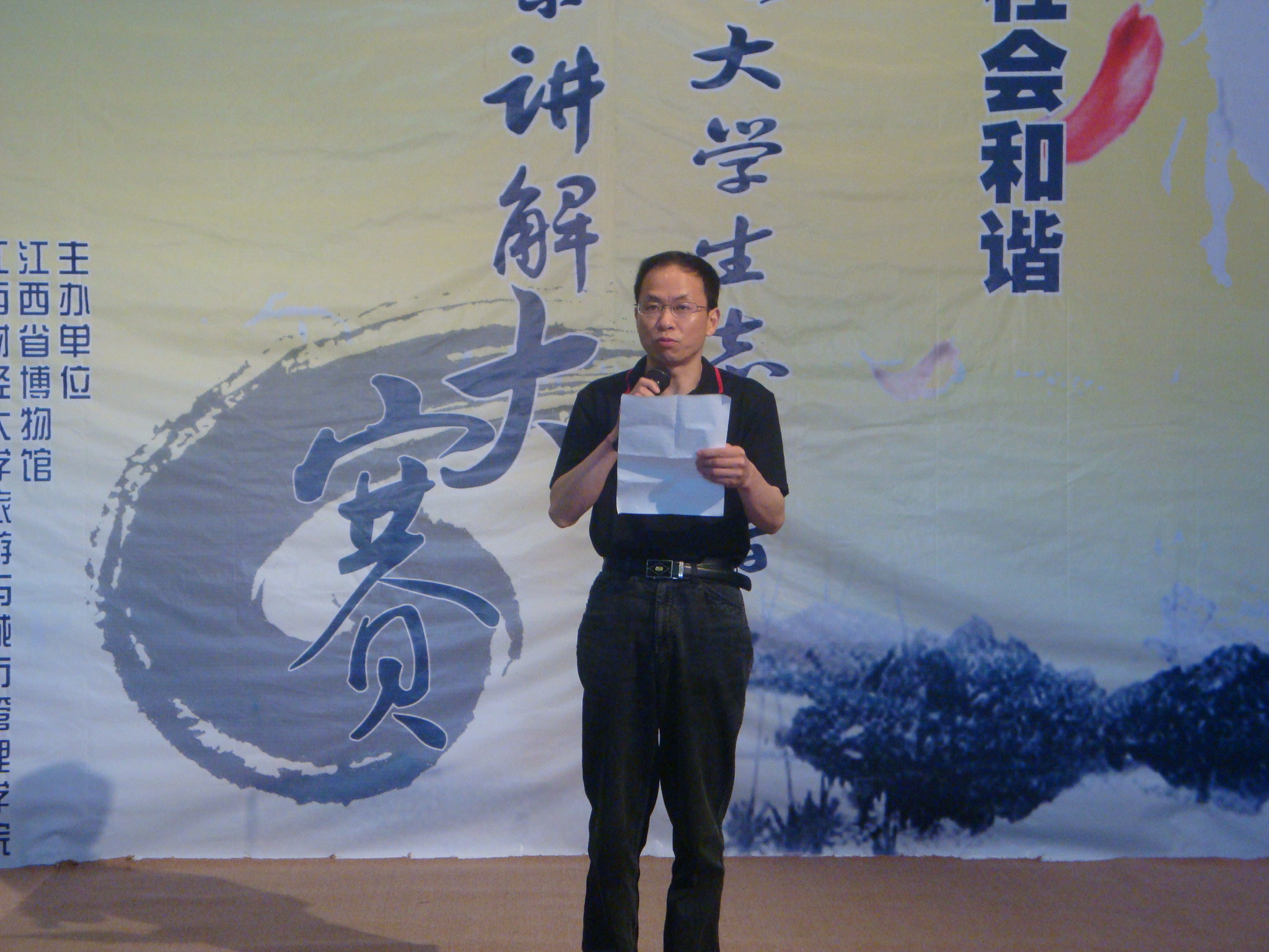此次比赛由江西省博物馆、江西农业大学国土资源与环境学院以及江西财经大学旅游与城市管理学院共同主办。比赛分为省博物馆实地解说以及知识问答两个环节,共有来自我校与江西财大共12名选手参加。实地解说环节主要围绕博物馆历史分馆第一层“灿烂赣文化”、第二层“江西客家风情”以及“珠山八友”展区,在讲解过程中选手还要接受由其他比赛选手设计的模拟游客大考验,考察选手在面对突发情况的应变能力。比赛过程中,选手们个个都精神饱满,就像一名真正的导游在耐心地为游客们讲解,面对临时考验也是稳定从容。经过激烈角逐,我院旅游091班的路阔同学夺得了大赛三等奖。(曾海东 孙世达)