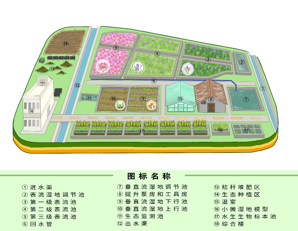 为增强公众环境意识与高校生态教育功能,湿地配套建设了多个教学与展示场所。其中,“⑯小微湿地模型”以简洁直观的方式展示湿地系统构造与运行机制;“⑰水生生物标本池”为学生与参观者提供近距离观察水生生物的机会;“⑱综合楼”承载着湿地的智能化管理、教学培训、科普展示、实验研究等多重职责,是基地的“大脑中枢”。