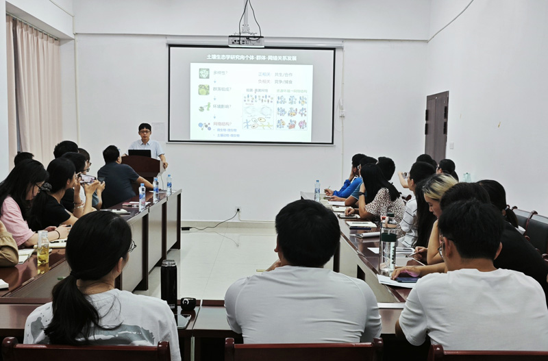 蒋瑀霁研究员详细介绍了红壤团聚体中线虫对土壤中碳氮磷转化的生物学过程,以及网络的关键物种维持群落稳定,驱动C、N、P养分转化过程相关研究及前沿进展。并对构建农田土壤健康评价指标体系,明确农田土壤健康的演变机制与过程表明了观点。随后,蒋瑀霁研究员与实验室师生进行了热烈的交流与讨论。