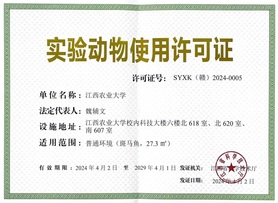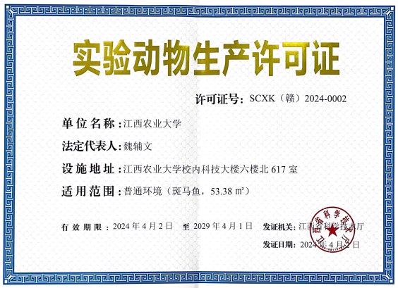 日前,经江西省科技厅审核批准,重点实验室斑马鱼平台成功获批“实验动物生产许可证、实验动物使用许可证”双证书,成为省内首个、国内第三家同时拥有这两项资质的单位,这标志着斑马鱼研究在我省迈向新的阶段。