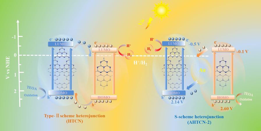 近日,实验室研究生罗密密在《Journal Of Materials Science & Technology》(中科院1区, 2022 IF= 10.319)上发表研究论文“Constructing Crystalline Homophase Carbon Nitride S-scheme Heterojunctions for Efficient Photocatalytic Hydrogen Evolution”。该研究通过光还原法制备了金纳米颗粒(NPs)负载的结晶型七嗪/三嗪基氮化碳(AHTCN) S型异质结光催化剂。除了Au NPs作为电子介质外,实验结果和DFT计算表明,锚定Au NPs后结晶的七嗪/三嗪基异质结(HTCN)的费米能级被拉低,HTCN的电子转移路径由II型转变为S型。由于S型异质结的存在,AHTCN-2(负载2 wt.% Au)具有最佳的光催化析氢性能,明显优于HTCN。本研究为s型异质结的构建提供了一种新的策略。