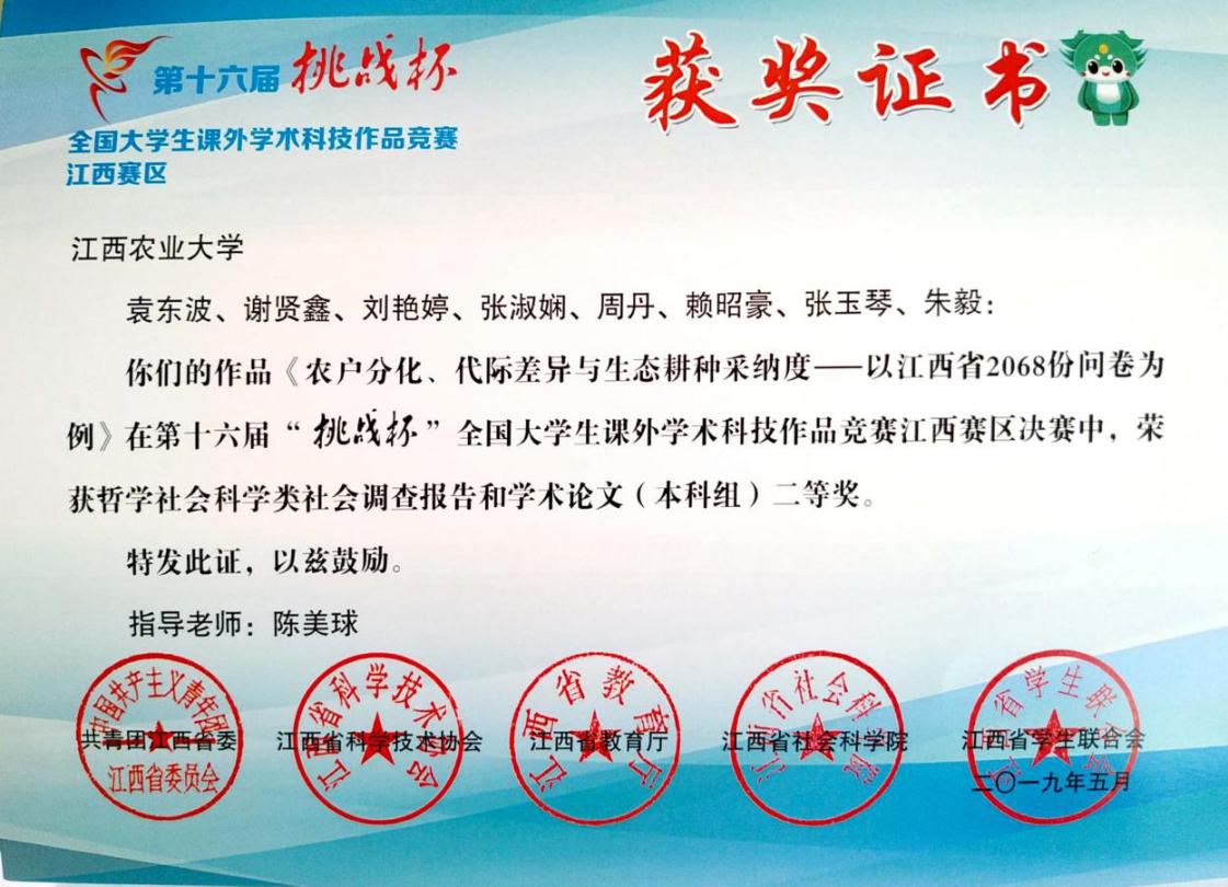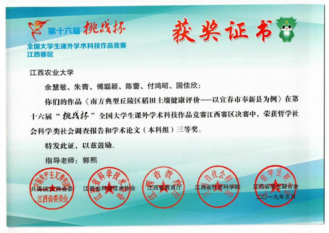 近日,第十六届“挑战杯”全国大学生课外学术科技作品竞赛江西赛区决赛结果公布,实验室两个团队喜获佳绩:2016级土地资源管理专业硕士研究生袁东波(指导老师:陈美球)等的作品《农户分化、代际差异与生态耕种采纳度——以江西省2068份问卷为例》、2017级土壤学专业硕士研究生余慧敏(指导老师:郭熙)等的作品《南方典型丘陵区稻田土壤健康评价——以宜春市奉新县为例》经过比赛初期的海选、校赛的评比双重选拔顺利入围省赛,经过经现场展示、评审答辩、评委会审定,最终分别获得二等奖、三等奖的佳绩。
