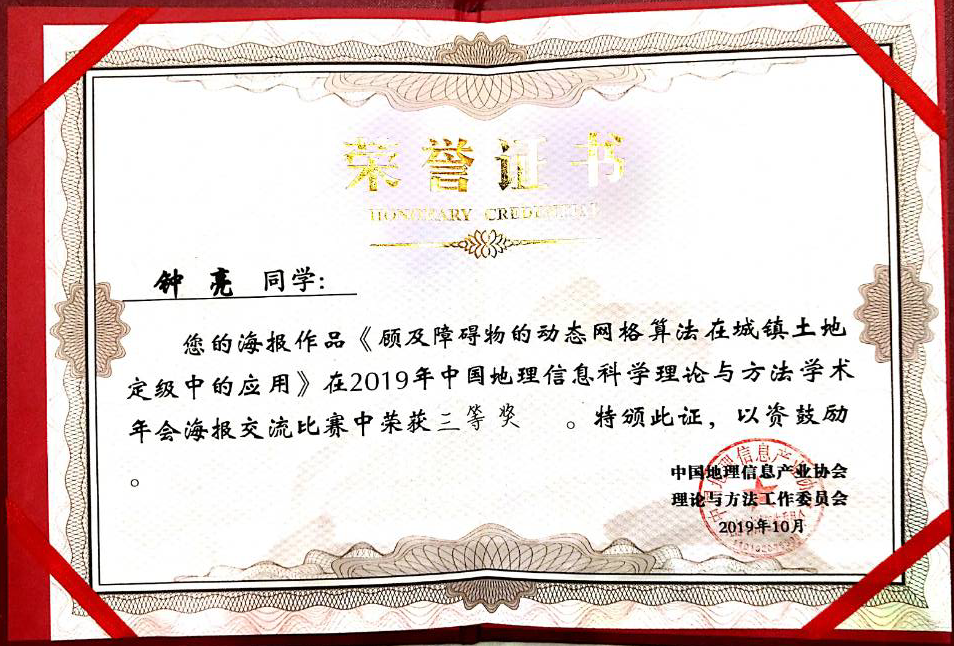 实验室赵丽红老师带队参加了本次会议,2019级土地资源管理专业硕士研究生钟亮同学进行了海报展示交流,凭借《顾及障碍物的动态网格算法在城镇土地定级中的应用》作品在海报交流比赛中荣获三等奖。