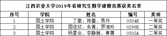 经2019年江西省研究生数学建模竞赛评审委员会评审、竞赛组织委员会认定,实验室共有3支队伍提交了参赛作品并获得一等奖一项、二等奖两项,相比往年,参赛队伍数量、获奖数量和获奖比例上均有大幅度提升。获奖名单如下: