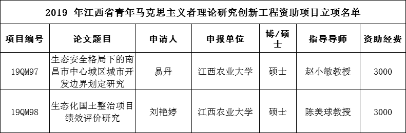 近日,由省委宣传部、省委教育工委(省教育厅)和省社联共同组织实施的江西省青年马克思主义者理论研究创新工程(简称“青马工程”)公布了资助项目立项名单,实验室两位硕士研究生获得了该项目资助,具体名单如下: