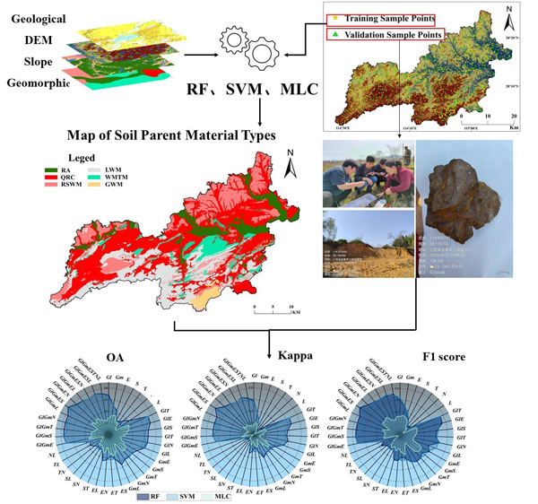 近日,实验室农业资源与环境专业硕士研究生曾学亮在《Remote Sensing》(SCI 2023 IF=5.0)上发表论文“High-Accuracy in Hilly Areas at the County Scale Using Machine Learning Algorithms”。该研究以江西省上高县为研究区探究丘陵县域尺度机器学习自动识别土壤母质类型的潜力,选取地质类型、地貌类型、高程、坡度等特征变量,利用RF、SVM和MLC三种机器学习分类算法识别土壤母质类型,其中利用RF得到的母质类型图精度最高,OA和Kaapa系数分别为83.11%和0.79。